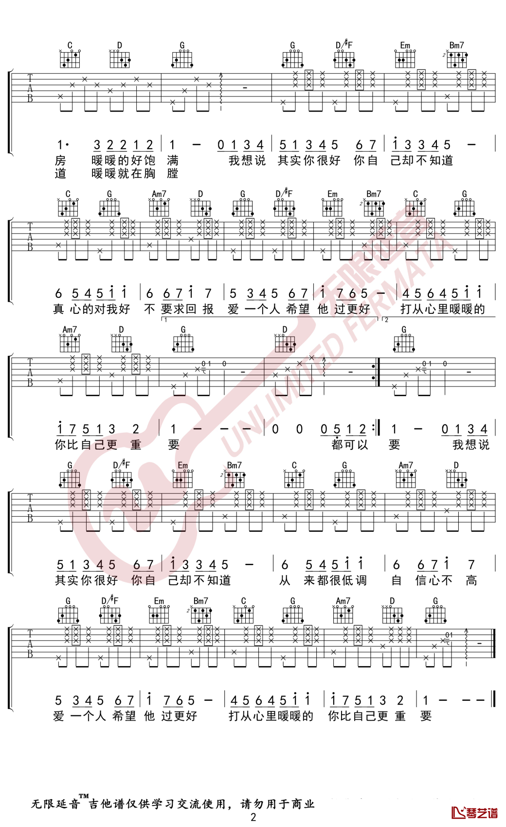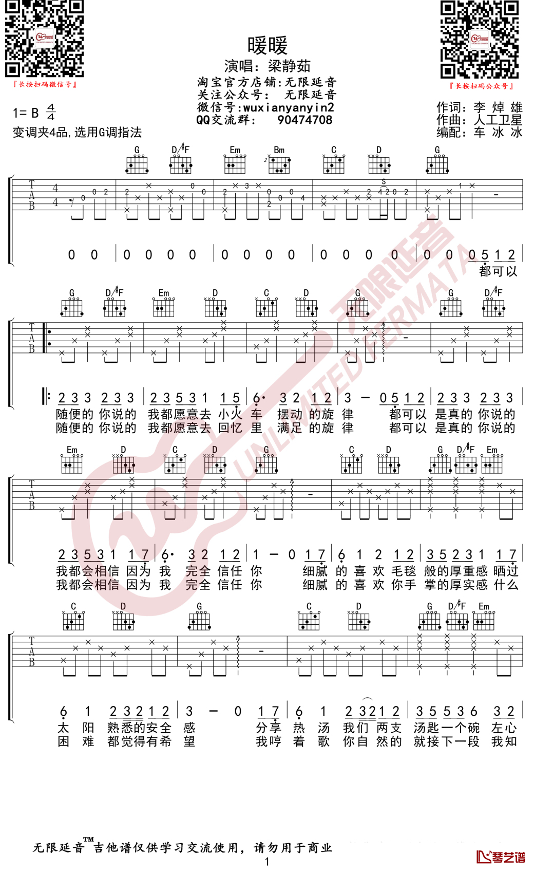 曲谱介绍: 梁静茹《暖暖》吉他弹唱谱,采用G调指法编配,共有2张高清图谱,免翻页排版设计。