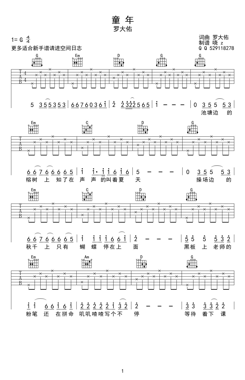 曲谱介绍: 《童年》吉他谱,罗大佑的经典代表歌曲,满是夏天悠长的气息。童年六线谱,G调简单版,弹唱谱共两张图片,晓Z编配,更新上传。