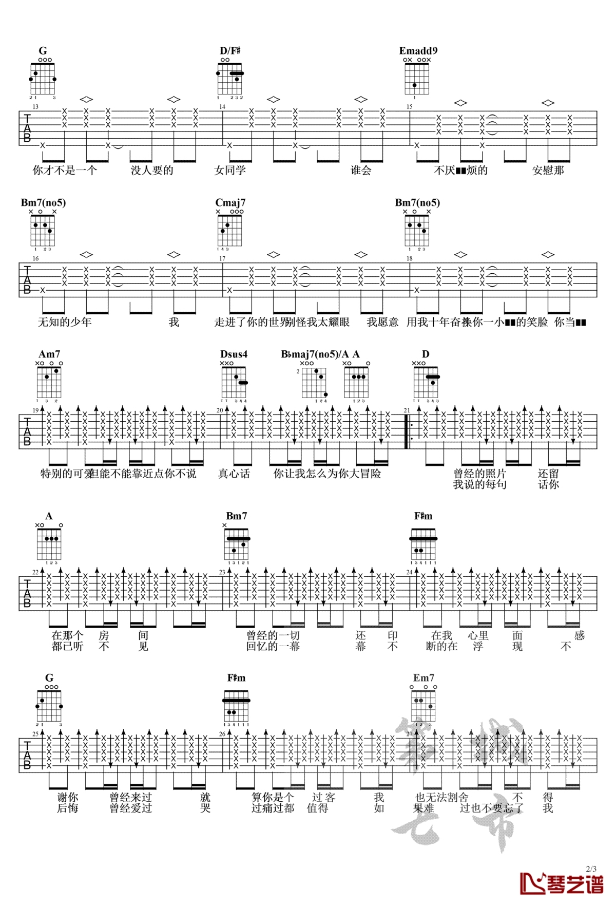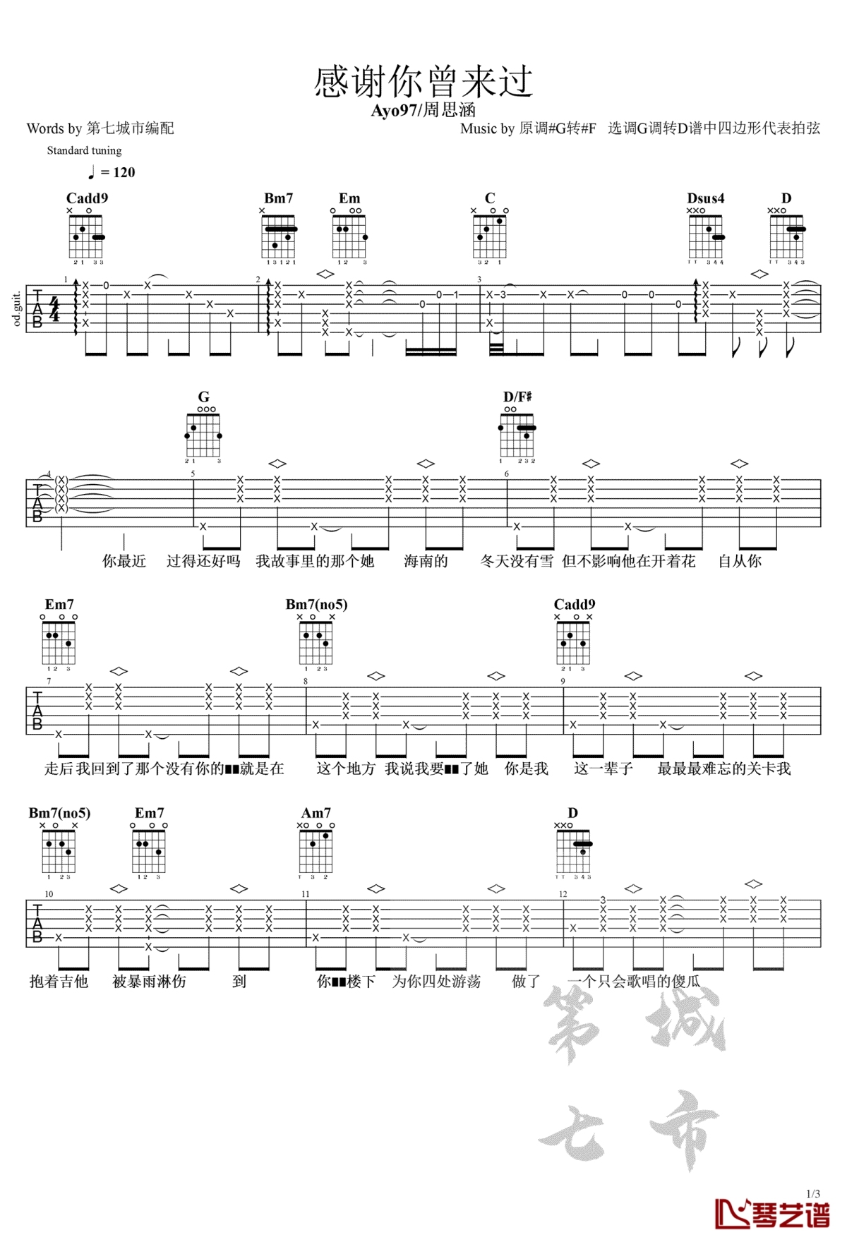 曲谱介绍: 周思涵《感谢你曾来过》吉他弹唱谱,采用G调指法编配,共有3张高清图谱。