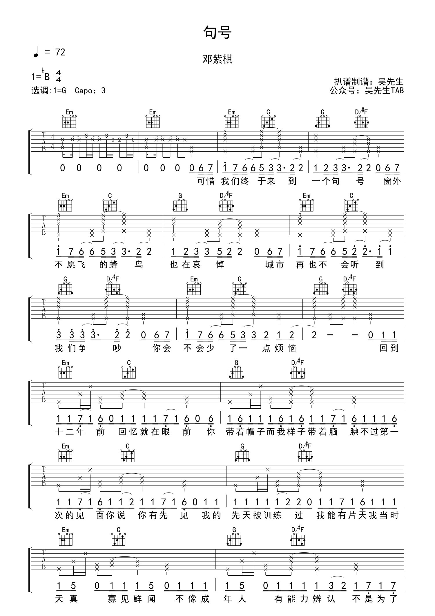 曲谱介绍: 《句号》吉他谱,邓紫棋演唱的这首新歌,鼓励所有需要拿出勇气的人。句号六线谱,原调降B,选调G,CAPO夹三品,一首《句号》,结束也是新生,邓紫棋从新上路。愿这个世界的人都能做到哪怕经历多少苦和泪,都能最后如这首《句号》一样,将事情画上句号,温柔以待这个世界。