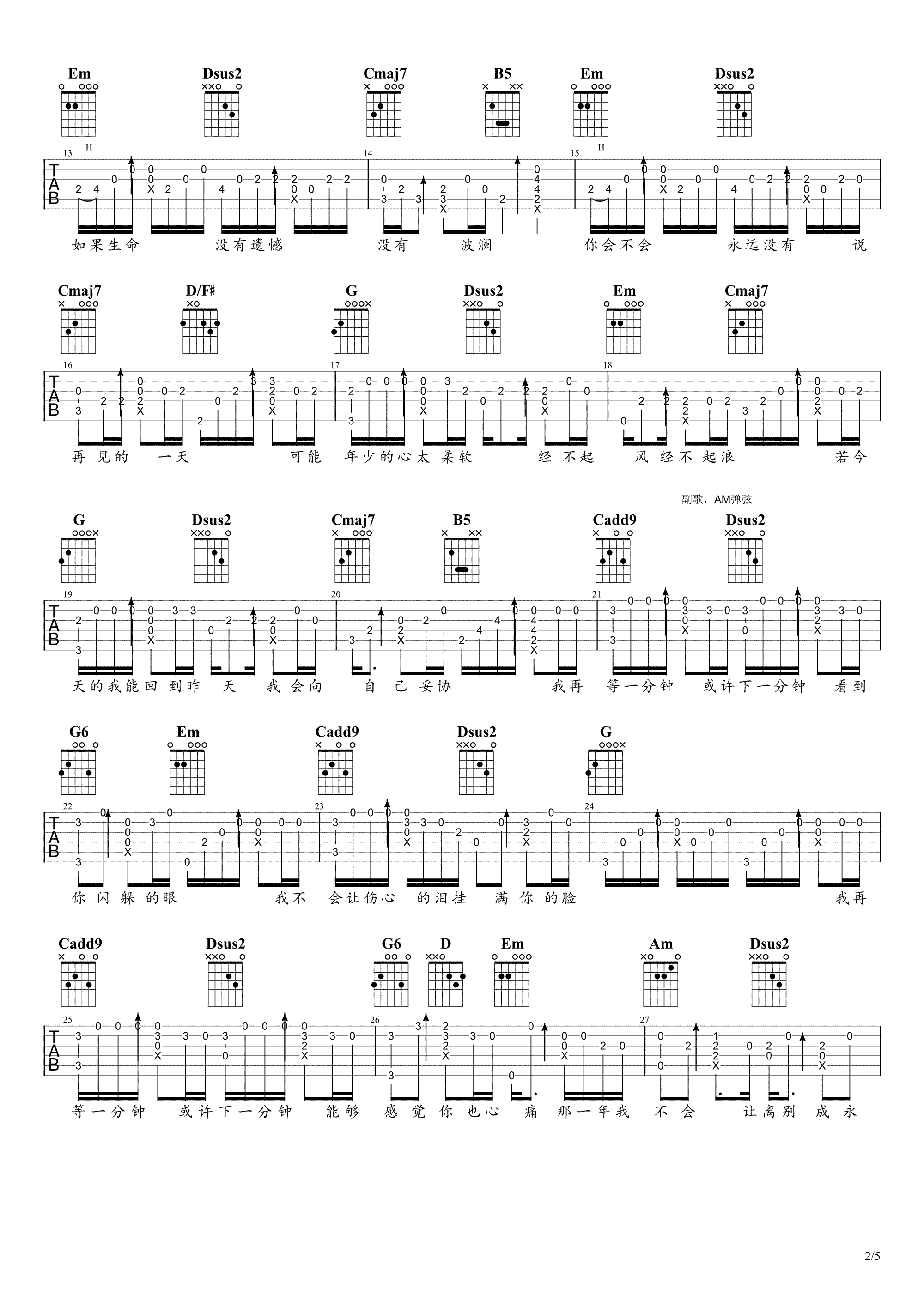 曲谱介绍: 《等一分钟》吉他指弹谱,徐誉滕的一首代表歌曲改编,等一分钟吉他独奏谱,完整版共五张图片谱。钟的吉他分享社出品,并同步分享指弹演奏视频,整理上传。 钟亚老师演奏说明:原调,升F调,我用的G调和弦指法编配的,变调夹加2品,实际弹得是A调。 主歌用了拍扫弦,副歌用了AM弹弦技巧,间奏也很认真地编了。整首曲子,放慢了速度弹,感觉好听一点。