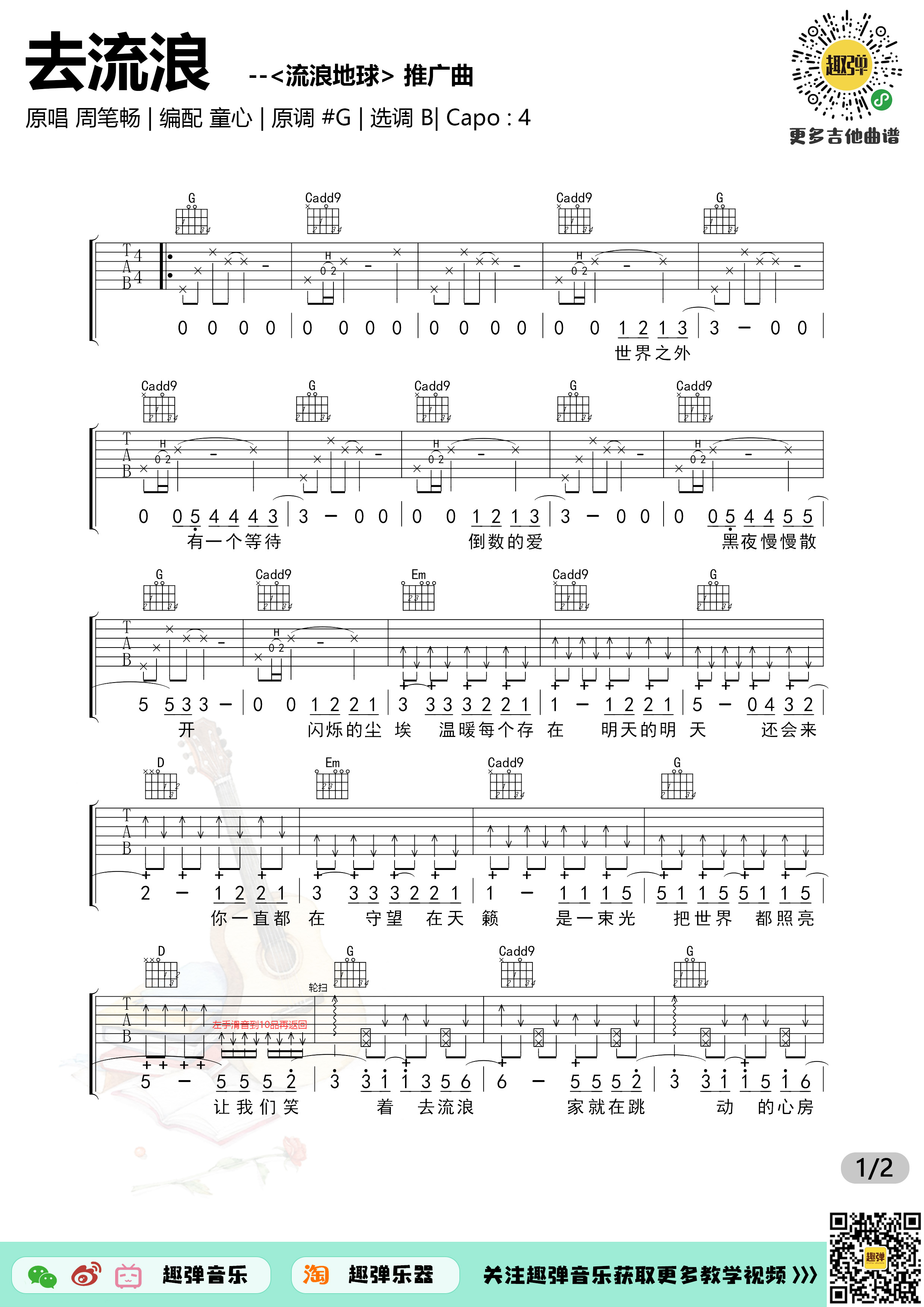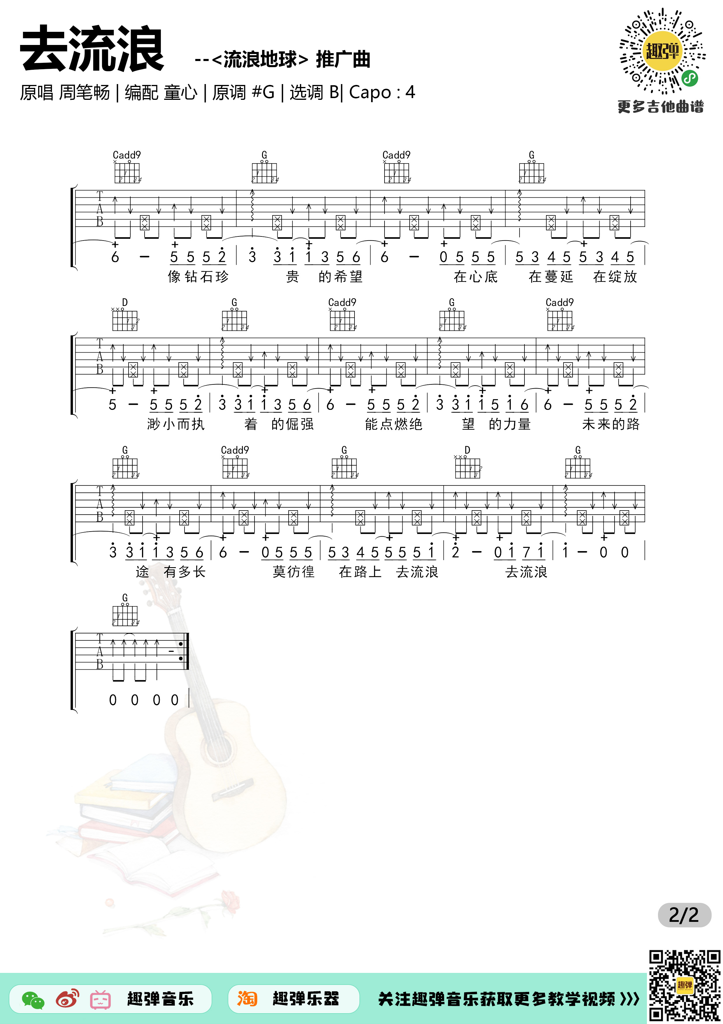 曲谱介绍: 周笔畅《去流浪》吉他弹唱谱,共有2张高清图谱,免翻页排版设计。