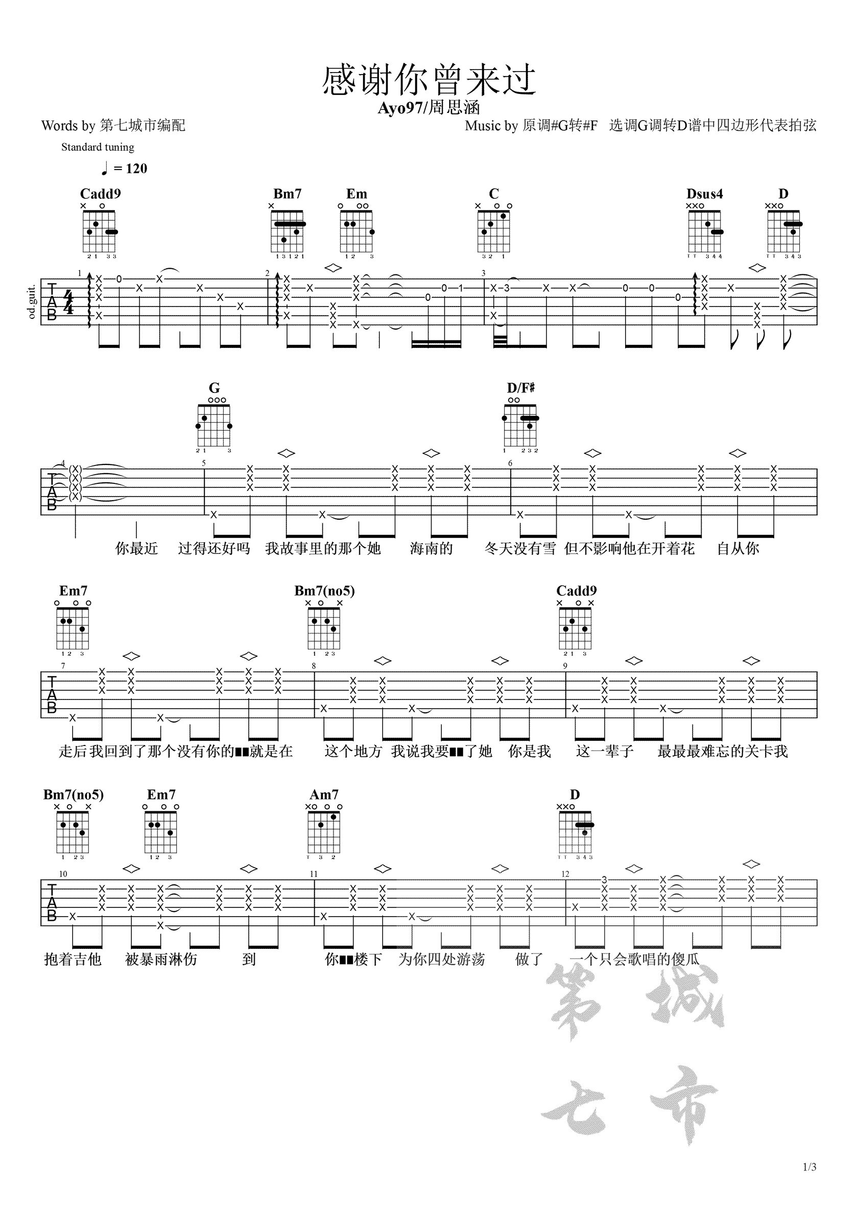 曲谱介绍: 《感谢你曾来过》吉他谱,周思涵和Ayo97演唱,一首非常治愈的失恋情歌,感谢你曾来过六线谱,选用G转D调男生版编配,三张弹唱图片谱。第七城市制谱出品,整理上传。