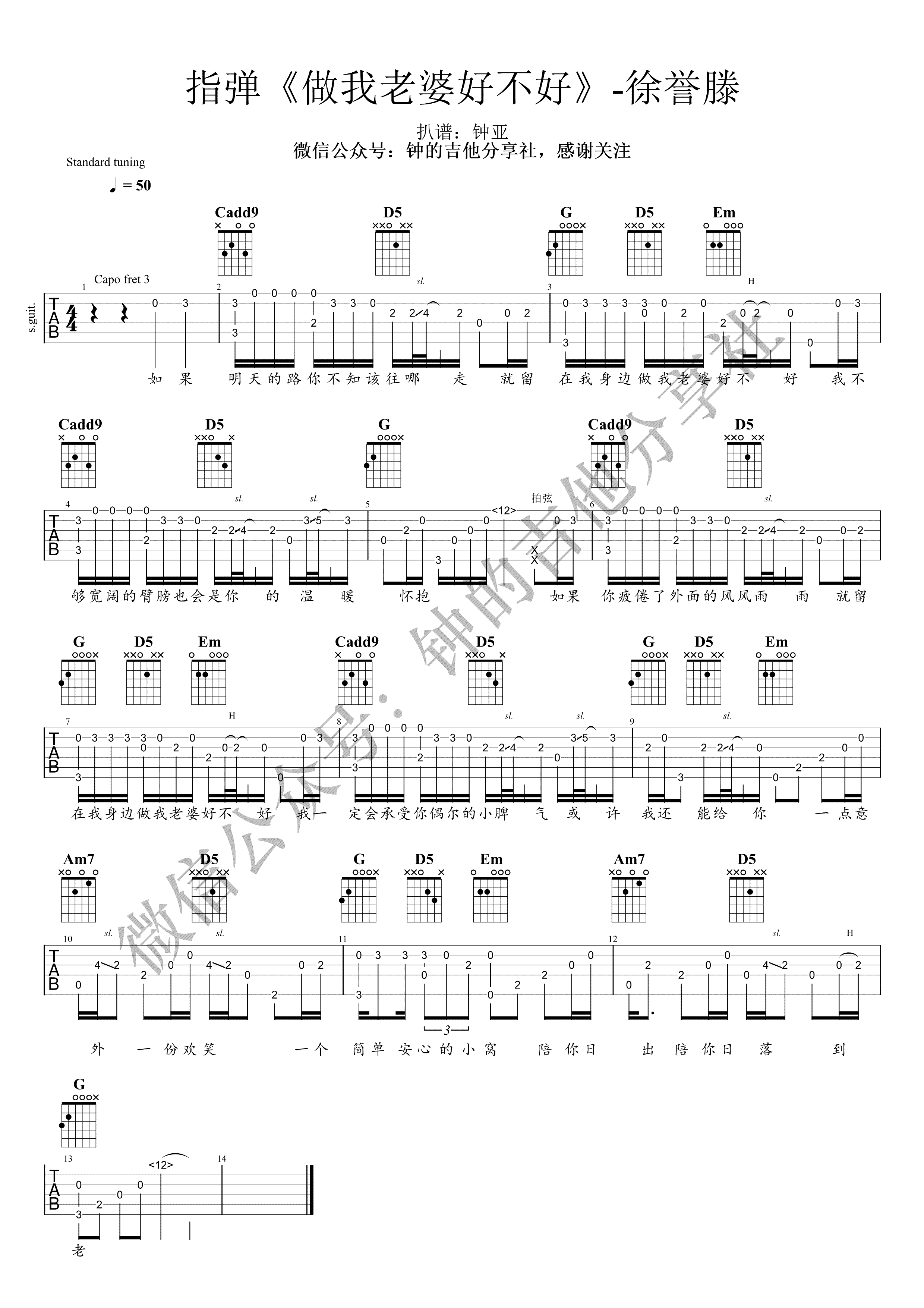 曲谱介绍: 做我老婆好不好指弹吉他谱,徐誉滕代表歌曲改编,做我老婆好不好吉他独奏谱,CAPO夹三品,高清图片谱,钟的吉他分享社编配出品,随谱附上指弹演奏视频,整理上传。 钟亚老师编配演奏说明:原唱G调,我变调夹家3品G调指法编配,实际音高是#A调。 G调各级和弦:G-Am-B-C-D-Em-#Fdim 和弦大致走向:C-D-G-Em-C-D-G 和弦级数走向:4-5-1-6-4-5-1 ,虽有点简单,但是里面的一些音符节奏还是有点难把握的。