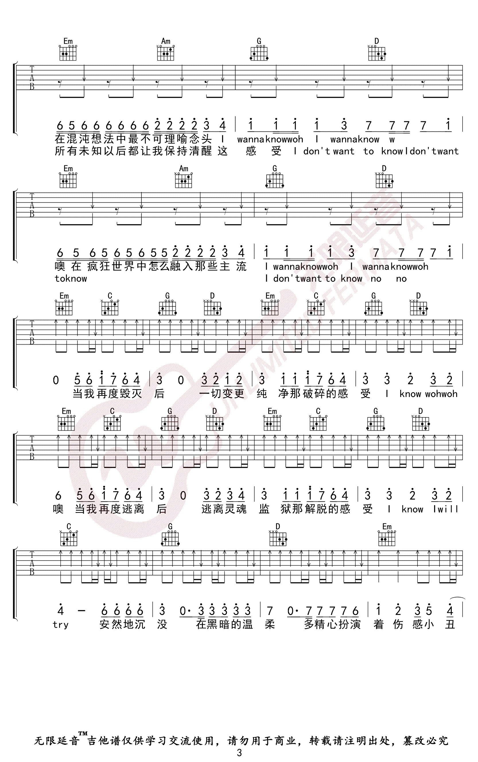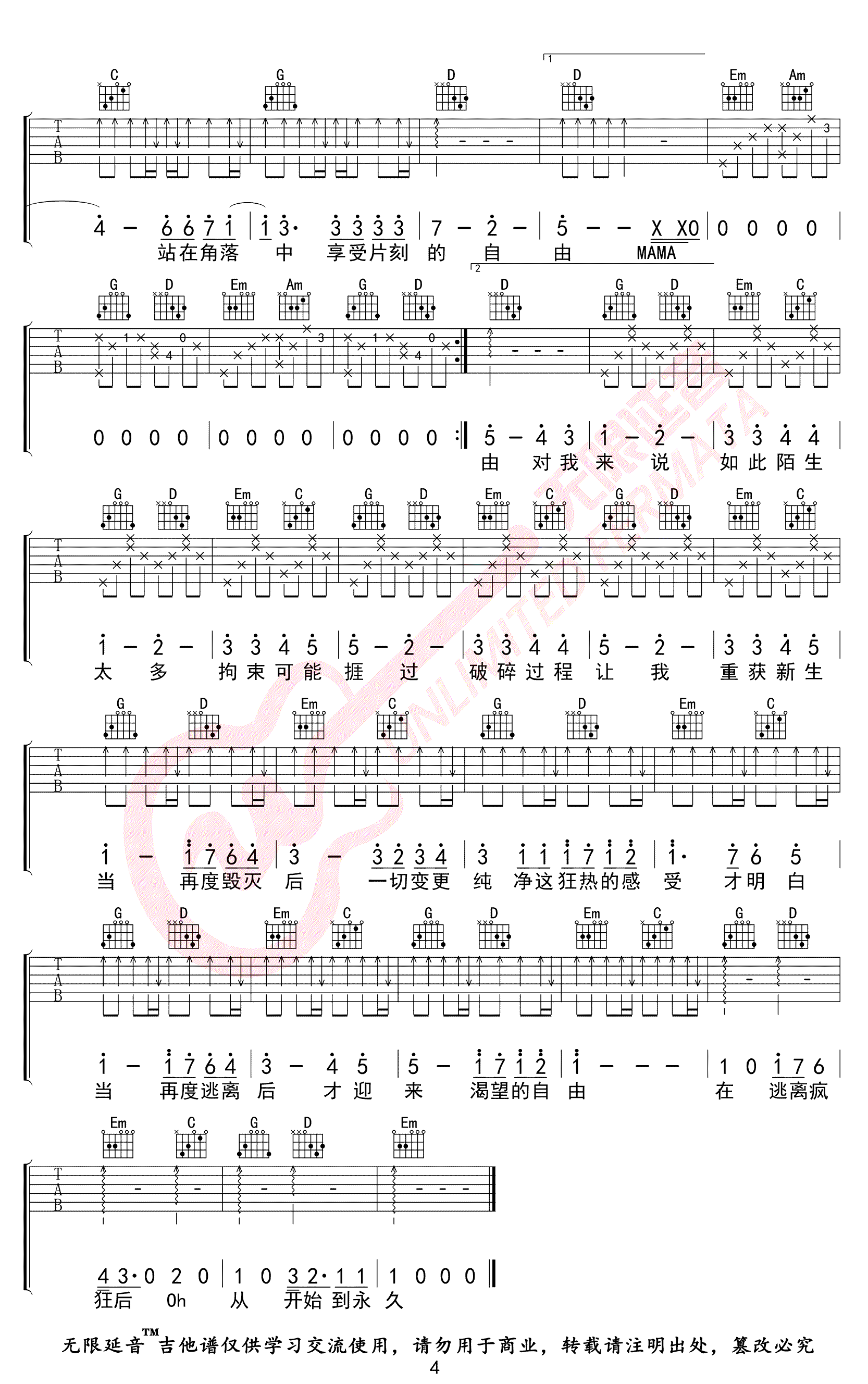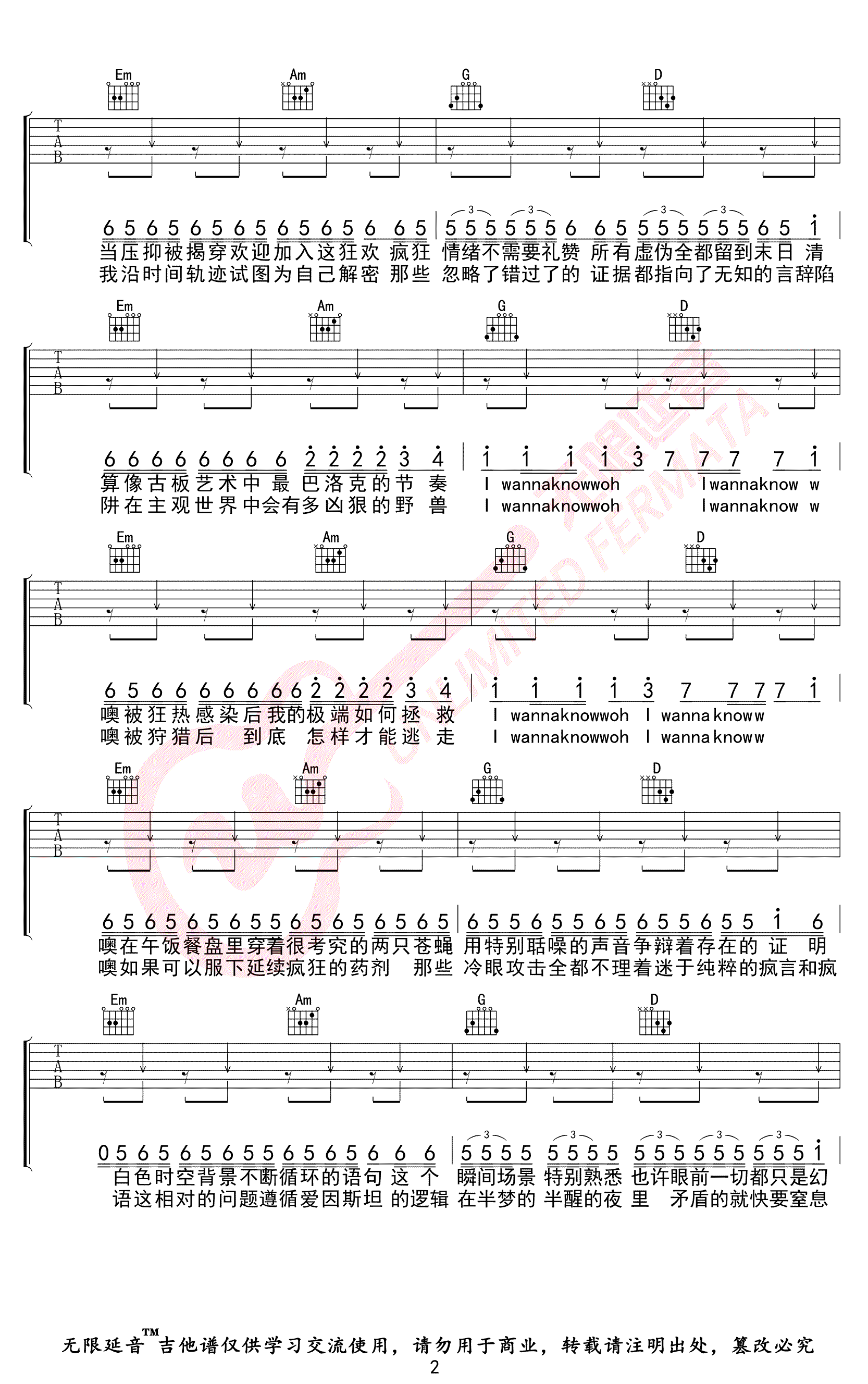曲谱介绍: 《疯人院》吉他谱,华晨宇演唱,火星三部曲的第二首,疯人院六线谱,选用G调指法,变调夹夹第四品。完整高清弹唱谱共四张图片,无限延音编配出品,上传更新。