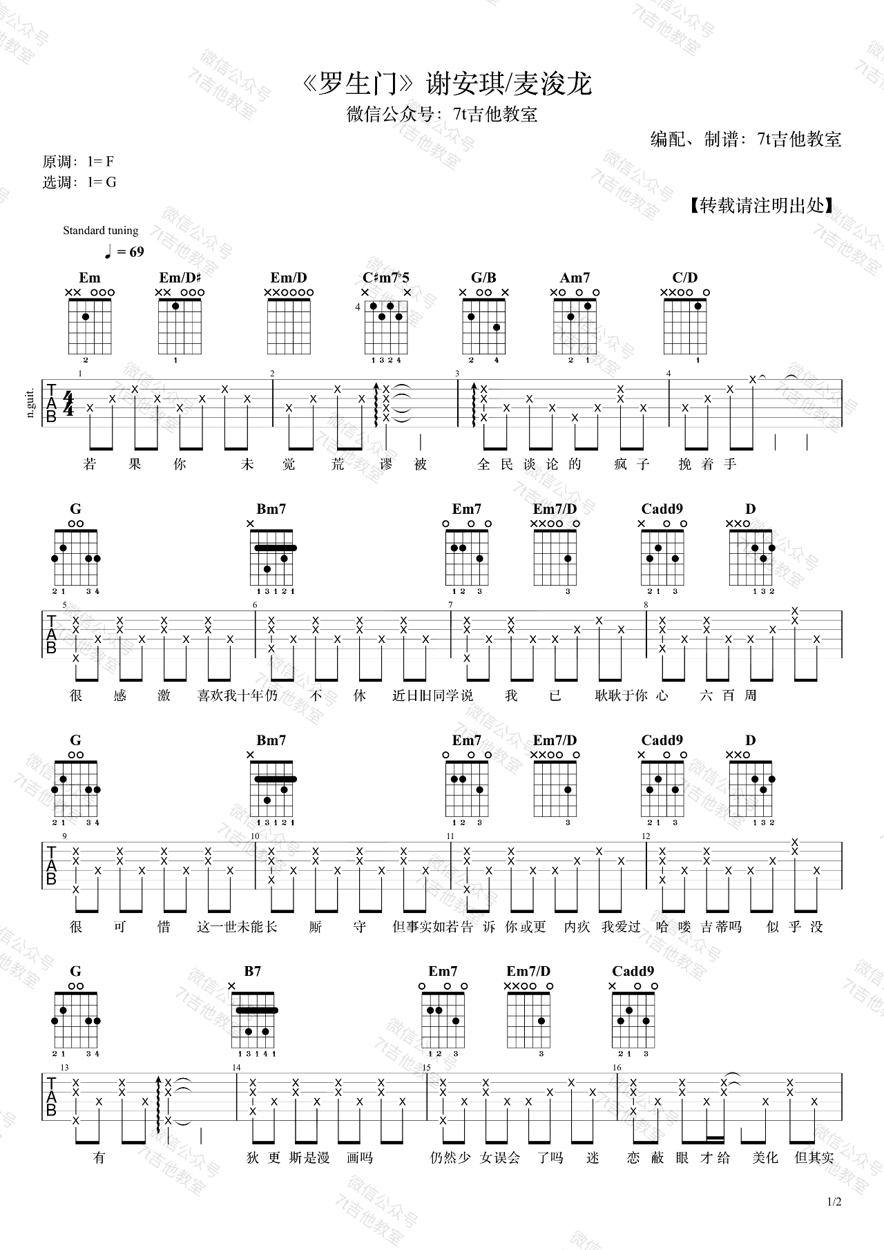 曲谱介绍: 谢安琪麦浚龙《罗生门》吉他谱,这首歌的原调是F大调,视频里用的是G大调的指法来编配,适合音域较低的男生。女生建议比我多夹几品哦!右手节奏型方面大家可以自由发挥,不必完全按照谱子上的来弹,感谢7t吉他教室编配制谱,更新分享。 一首男女合唱的粤语歌曲,虽然双方对分手的理由各执一词,但结局真的也无关紧要了。学会放下,才能重新开始。爱己才能爱人,希望每个人都有属于自己的独立人格。
