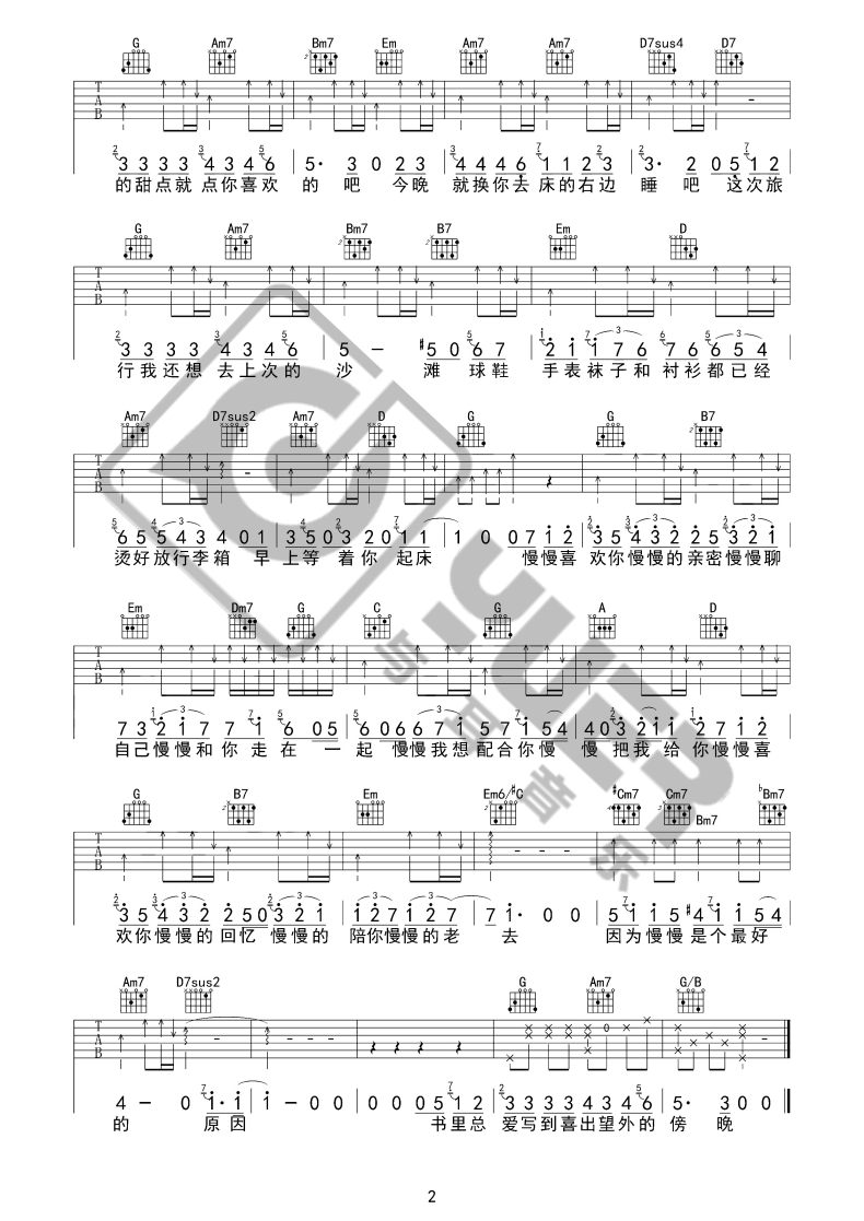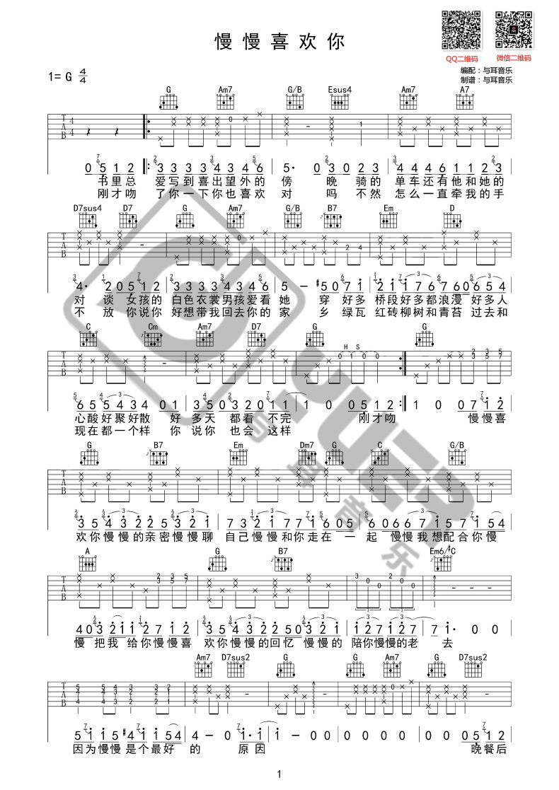 曲谱介绍: 《慢慢喜欢你》吉他弹唱谱,共有2张高清图谱,免翻页排版设计。