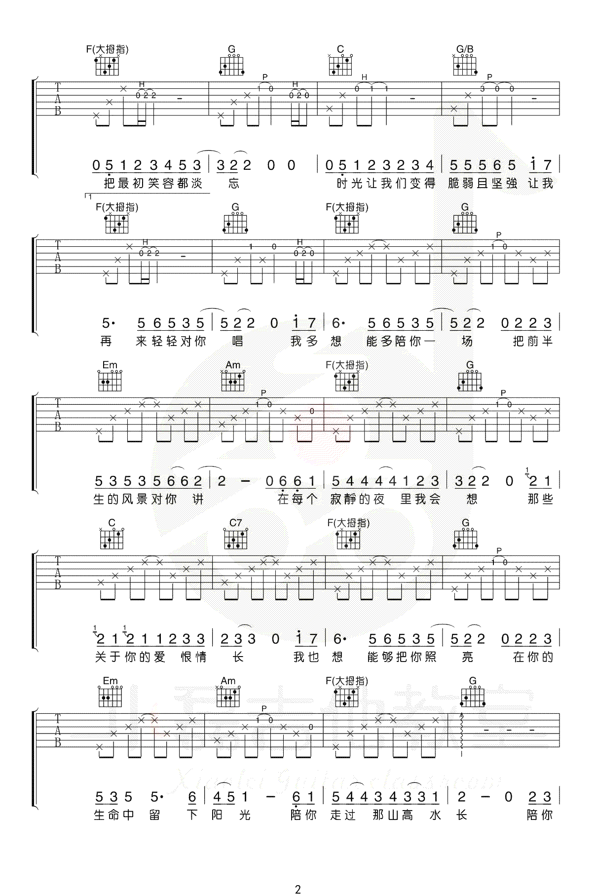曲谱介绍: 这一生关于你的风景吉他谱,隔壁老樊版本,枯木逢春词曲原创,原调升C选用C调指法,CAPO夹一品。这一生关于你的风景六线谱,完整编配共四张弹唱图片谱,感谢小磊吉他制谱出品,更新上传。 原版中编排的也不难,吉他部分都是沿袭原版的编排,间奏原版中是双吉他,这里也是老师一贯风格,改编成一个吉他来完成,整体算是比较完整的吉他弹唱乐谱。