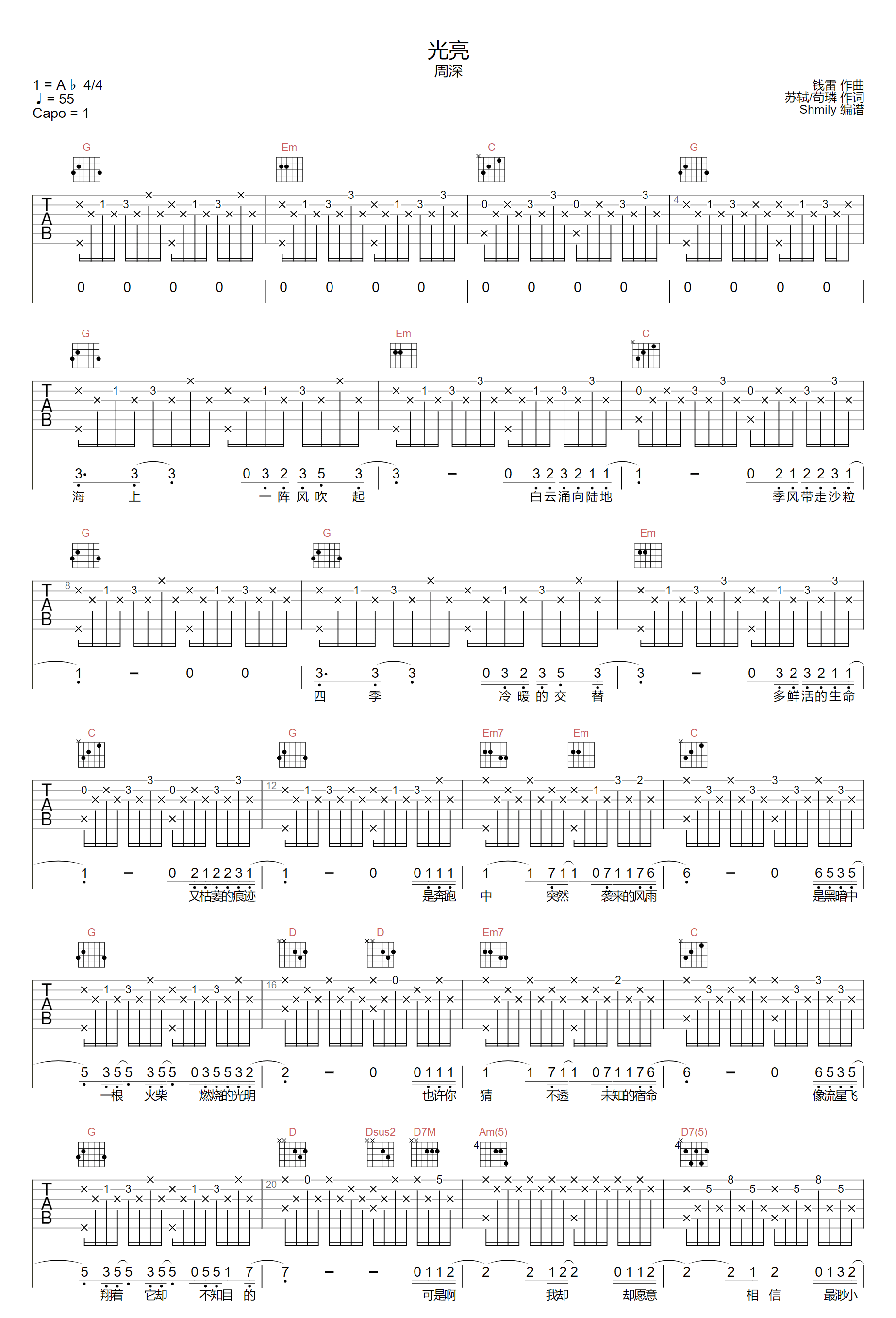 光亮吉他谱 - 周深 - G调吉他弹唱谱 - 原版