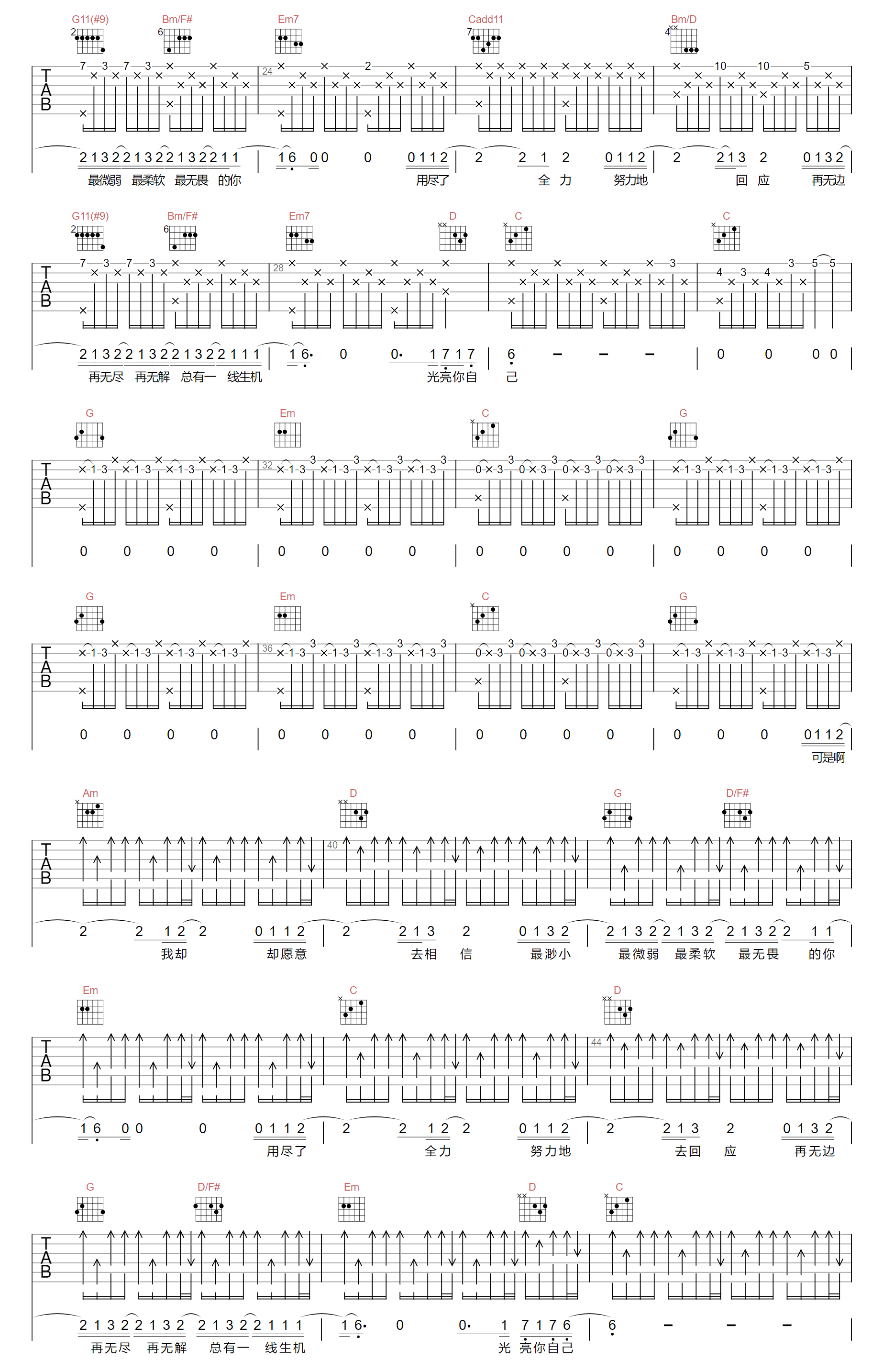 曲谱介绍: 吉他谱介绍:光亮吉他谱,周深演唱的一首歌曲,4/4拍的节奏,这首歌曲的原调为降A调,这里曲谱采用了G调指法进行编配,演唱时夹变调夹1品可回到原调,也可根据个人实际嗓音情况选择。曲谱由琴谱网更新上传,共3张高清图片弹唱吉他谱例,来源于@Shmily编配出品。周深用歌声让人体会跌宕人生的世事无常,犹如一场盛大的焰火表演。在高吭处,周深前所未有地使用了大面积的真声,唱出中华民族身处逆境时的不屈精神。