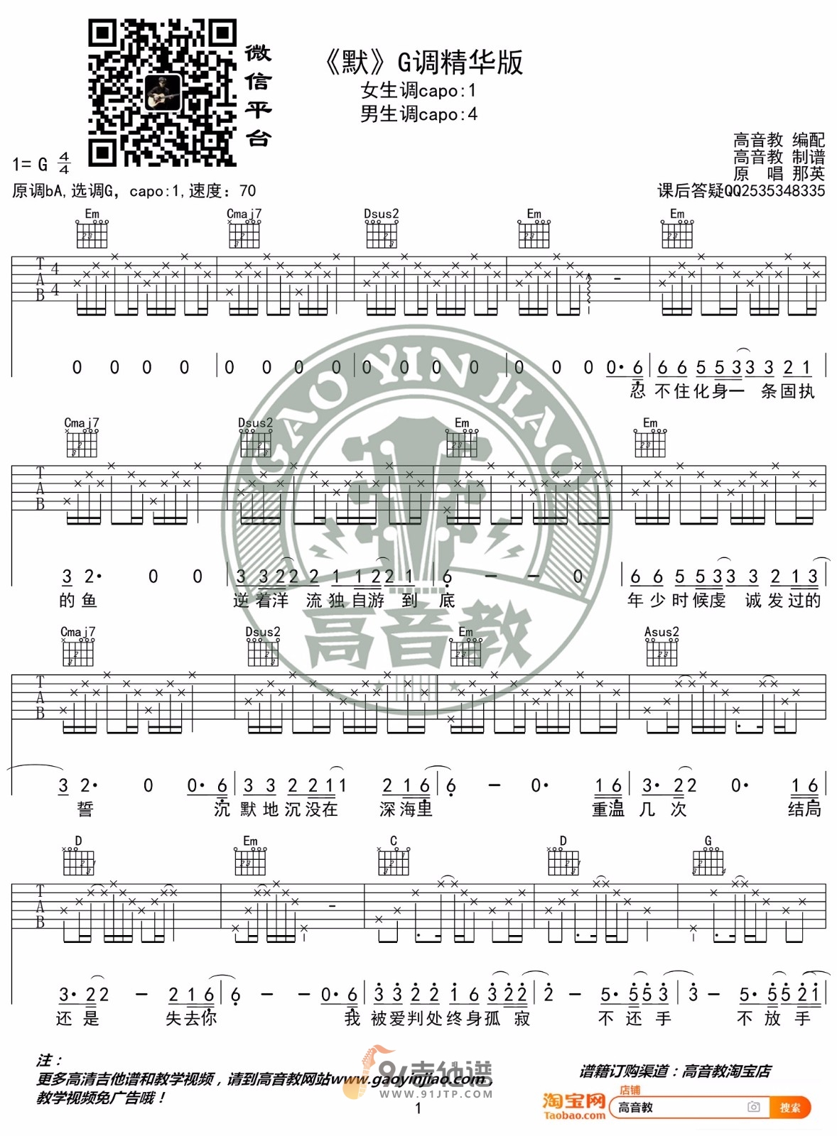 曲谱介绍: 曲谱简介:默吉他谱,周杰伦演唱的一首歌曲,4/4拍的节奏,这首歌曲的原调为降A调,这里曲谱采用了G调指法进行编配,演唱时夹变调夹1品可回到原调,也可根据个人实际嗓音情况选择。曲谱由高音教编配出品。这首歌曲是由歌坛老将那英演唱,是电影版《何以笙箫默》的主题曲,后来周杰伦和那英一起合唱过这首歌,男生女生皆可唱。