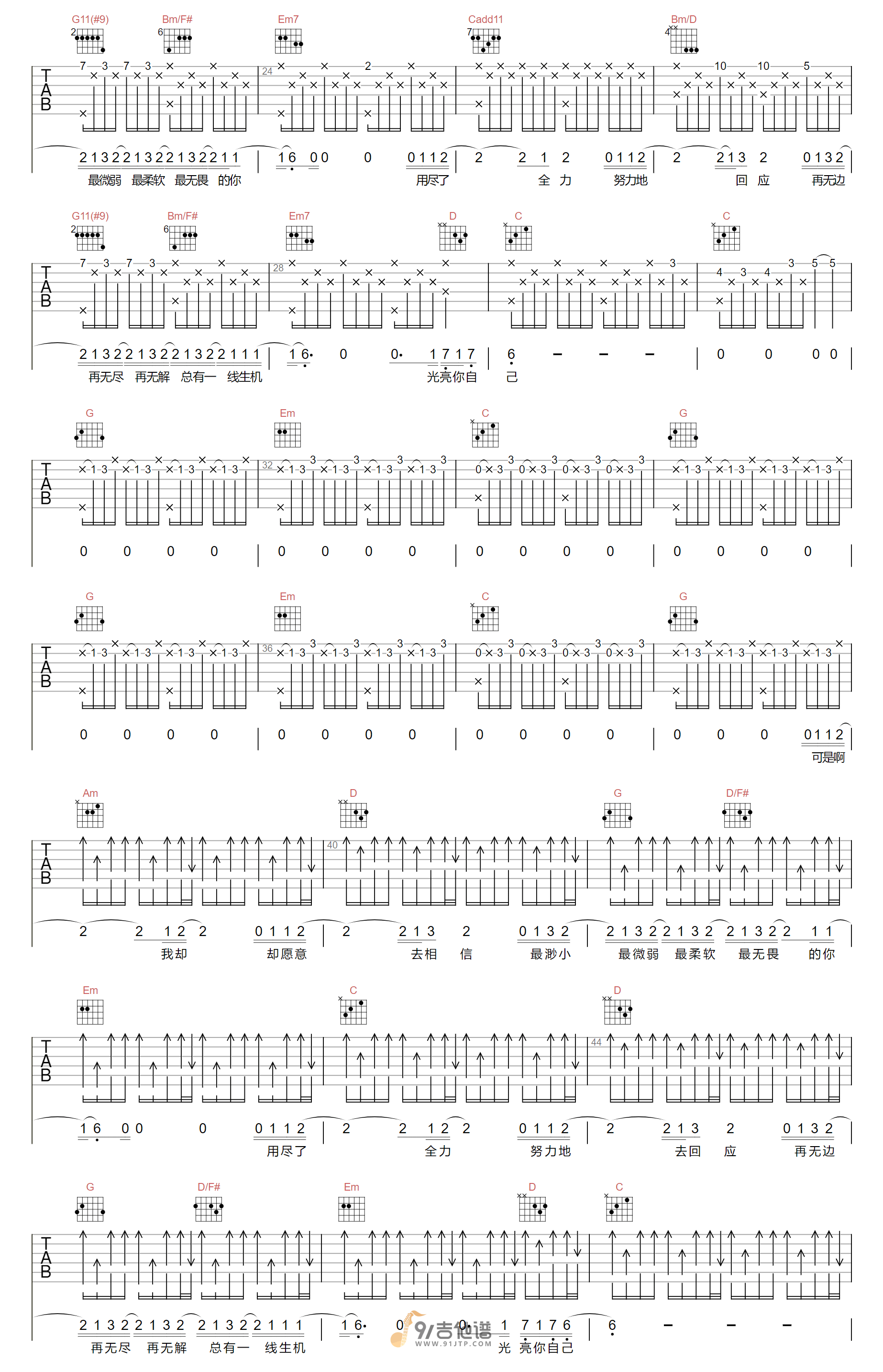 曲谱介绍: 曲谱简介:光亮吉他谱,周深演唱的一首歌曲,4/4拍的节奏,这首歌曲的原调为降A调,这里曲谱采用了G调指法进行编配,演唱时夹变调夹1品可回到原调,也可根据个人实际嗓音情况选择。曲谱由Shmily编配出品。周深用歌声让人体会跌宕人生的世事无常,犹如一场盛大的焰火表演。在高吭处,周深前所未有地使用了大面积的真声,唱出中华民族身处逆境时的不屈精神。