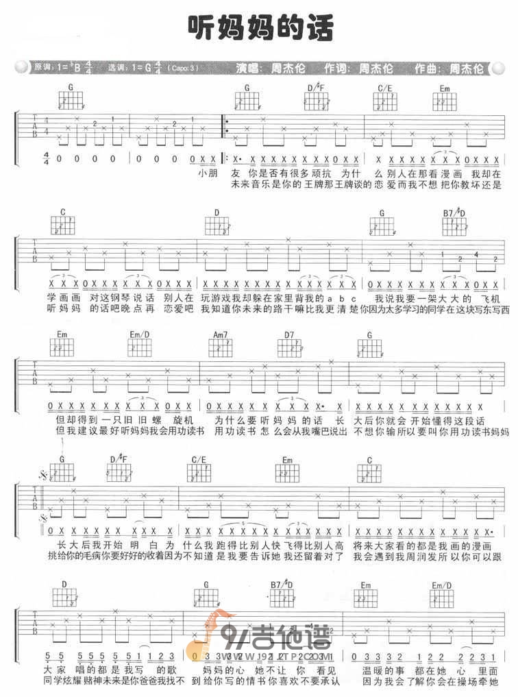 听妈妈的话吉他谱 - 周杰伦 - G调吉他弹唱谱 - 原版