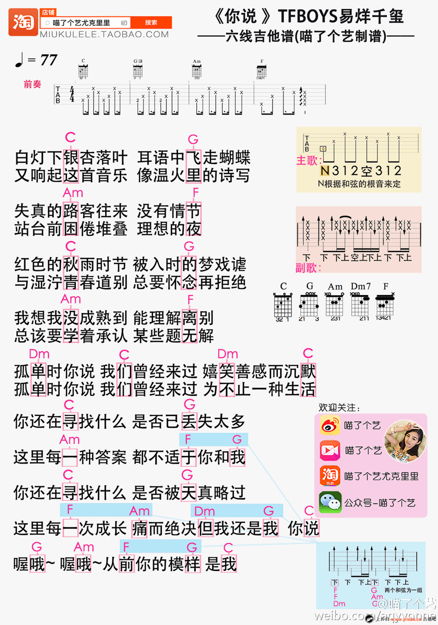 曲谱介绍: 易烊千玺新歌,你说吉他谱,TFBOYS易烊千玺的《你说》。曲谱带前奏,和弦按法、节奏型参考图片标注。