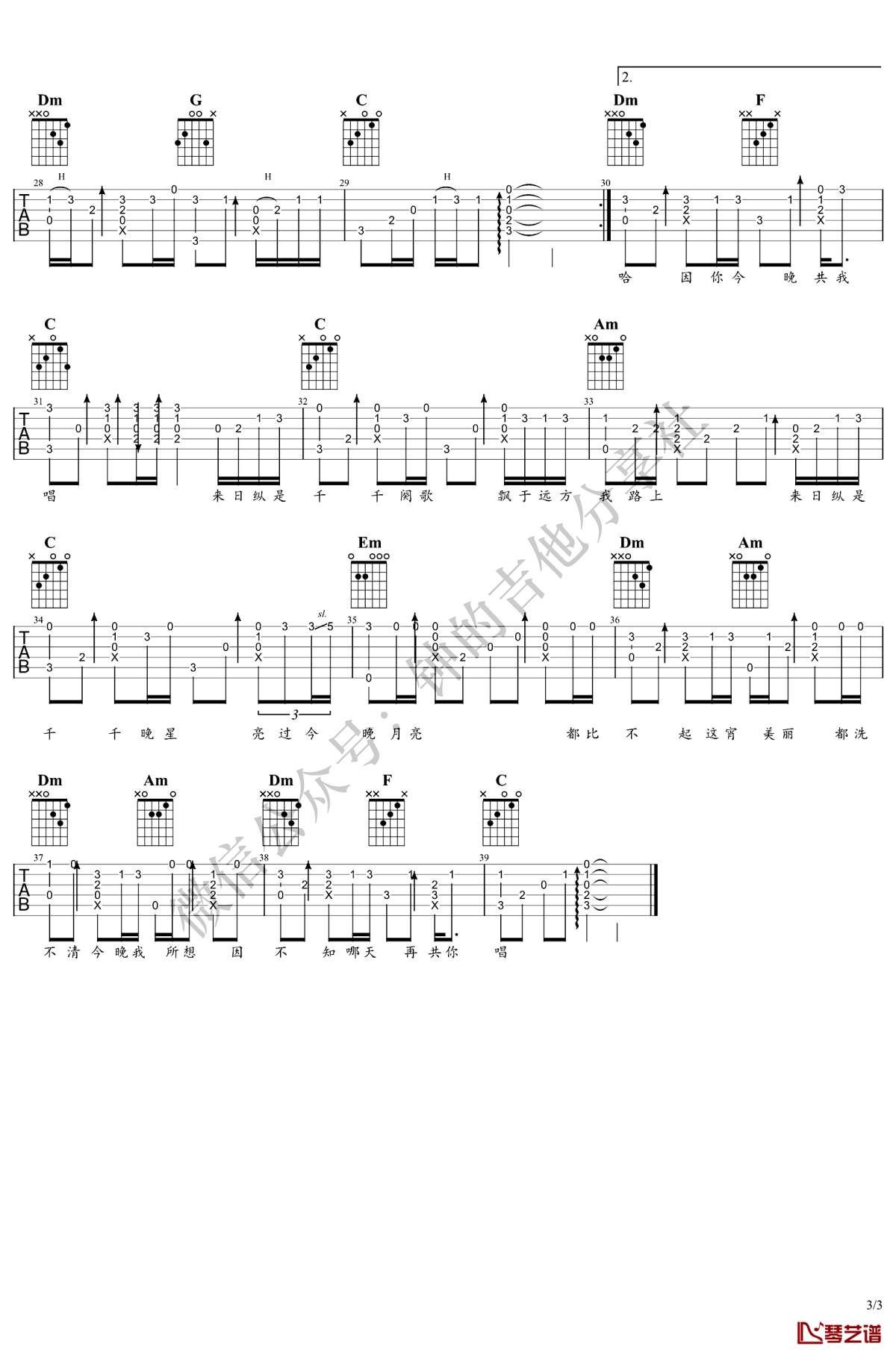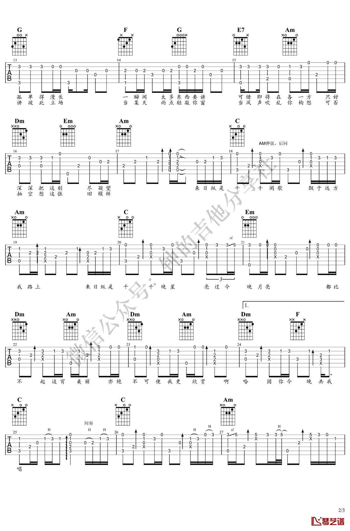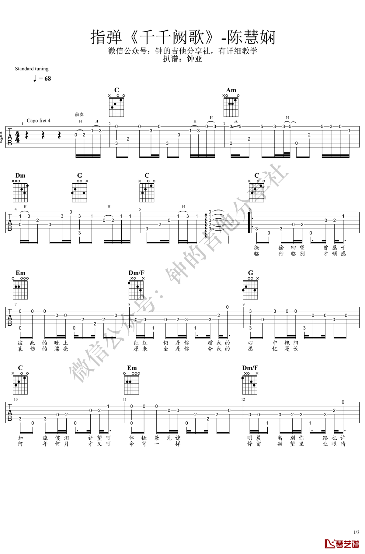曲谱介绍: 陈慧娴《千千阙歌》吉他独奏谱,共有3张高清图谱。