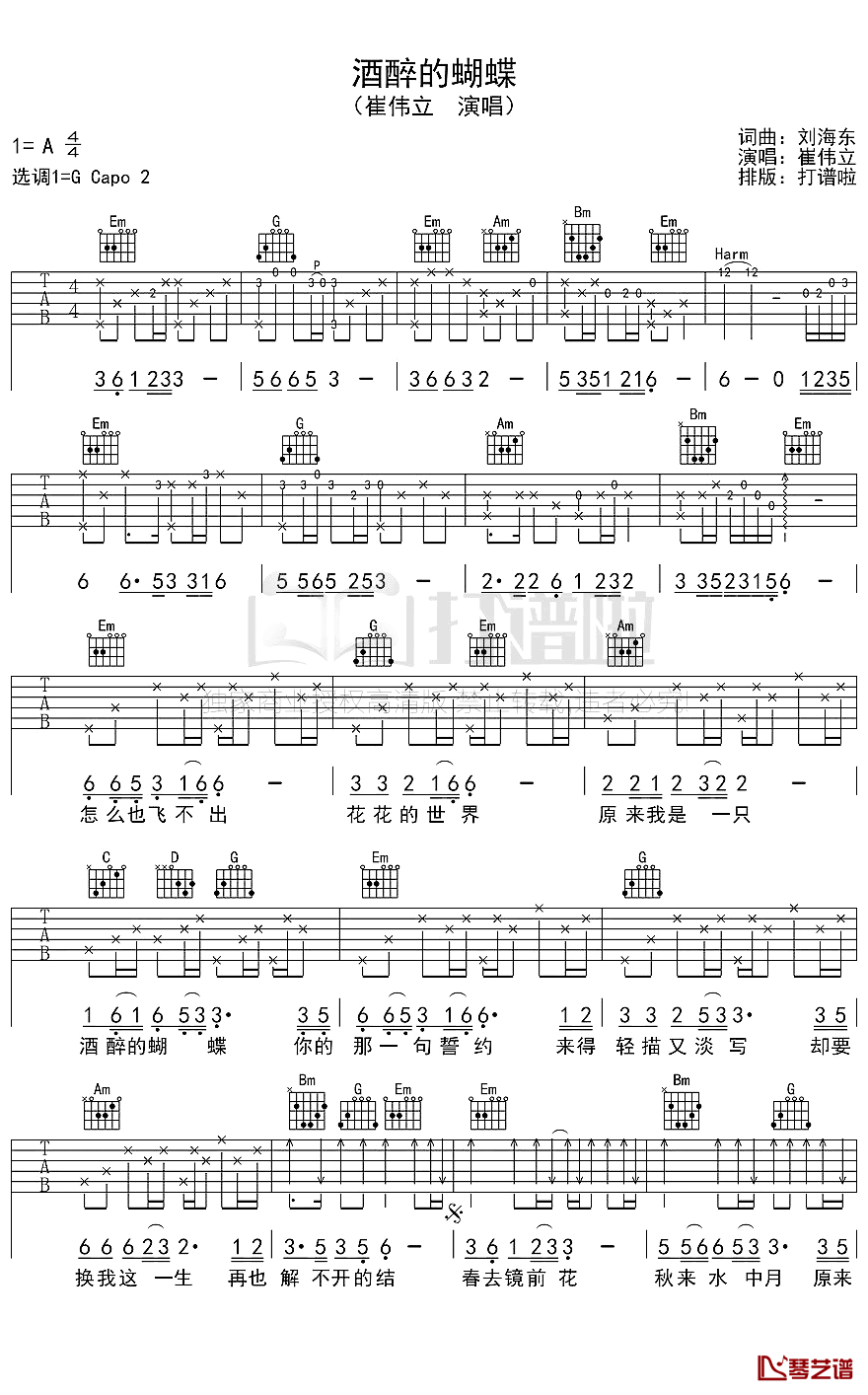 酒醉的蝴蝶吉他谱 - 崔伟立 - 吉他弹唱谱