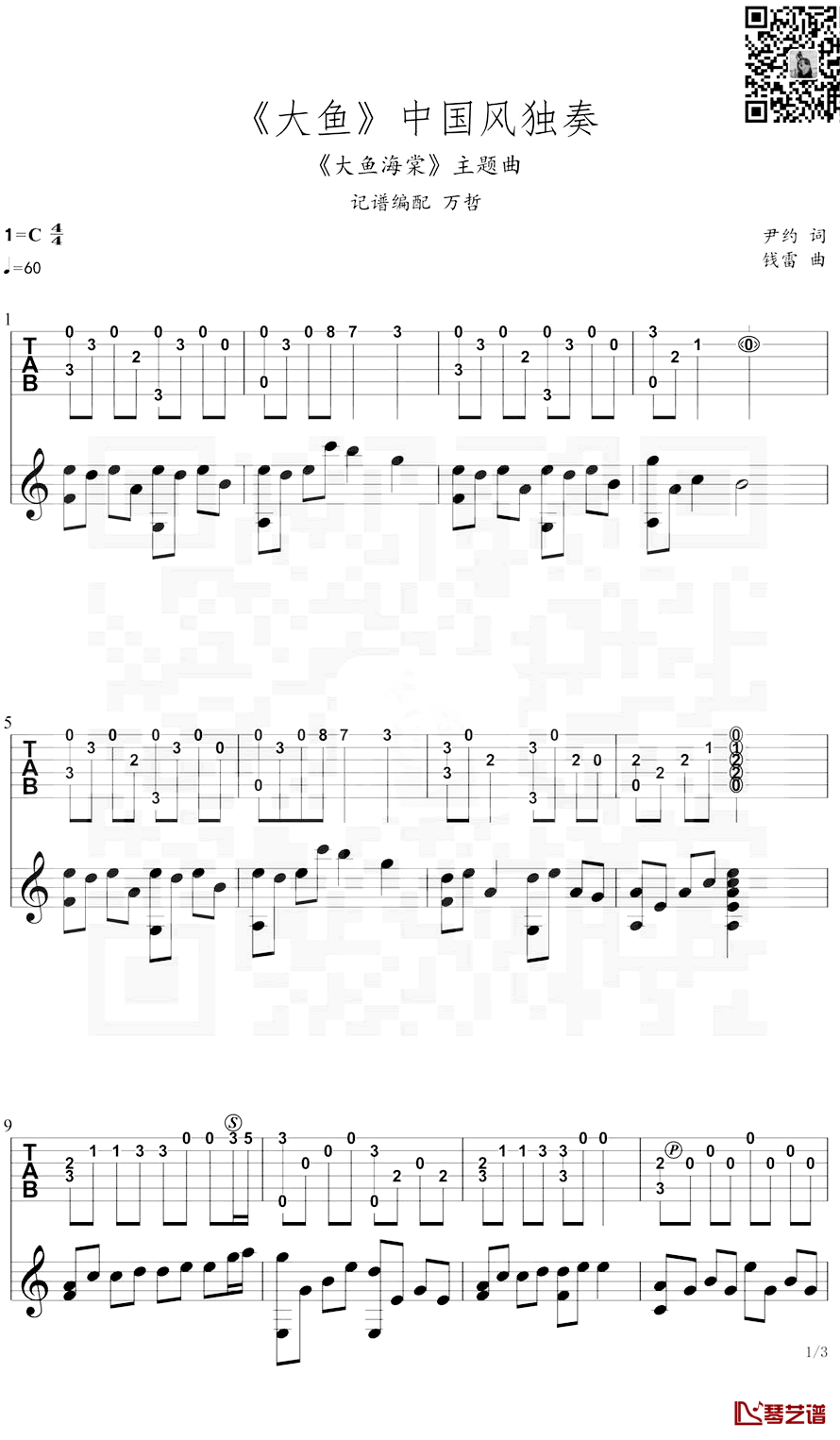 曲谱介绍: 周深《大鱼》吉他独奏谱,共有3张高清图谱。