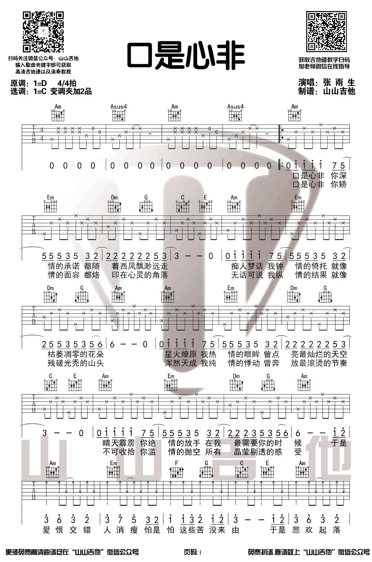 曲谱介绍: 《口是心非》吉他谱,为张雨生去世前的最后绝唱,口是心非六线谱,原调D,变调夹夹二品,选用C调指法编配,两张图片谱,山山吉他制谱出品,并带来曲谱配套吉他弹唱演示视频,上传推荐。 张雨生的歌声中带有一种天生的忧愁,字字句句都潜藏着敏感而浓烈的情感。 《口是心非》突然爆火,在抖音上也是无数人的翻唱,一首经典老歌,表达了那种言不由衷,爱恨不由人的伤感心情。