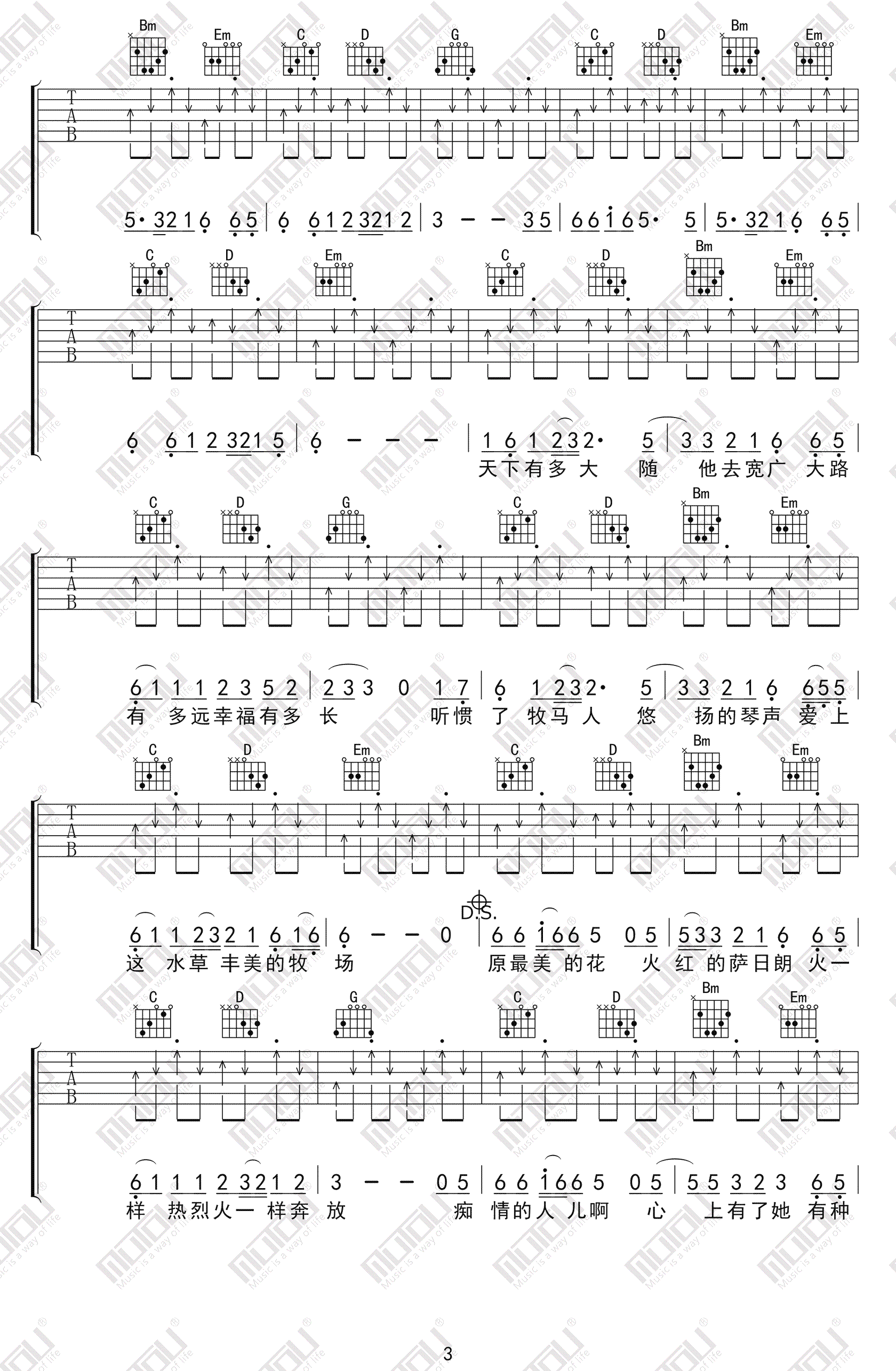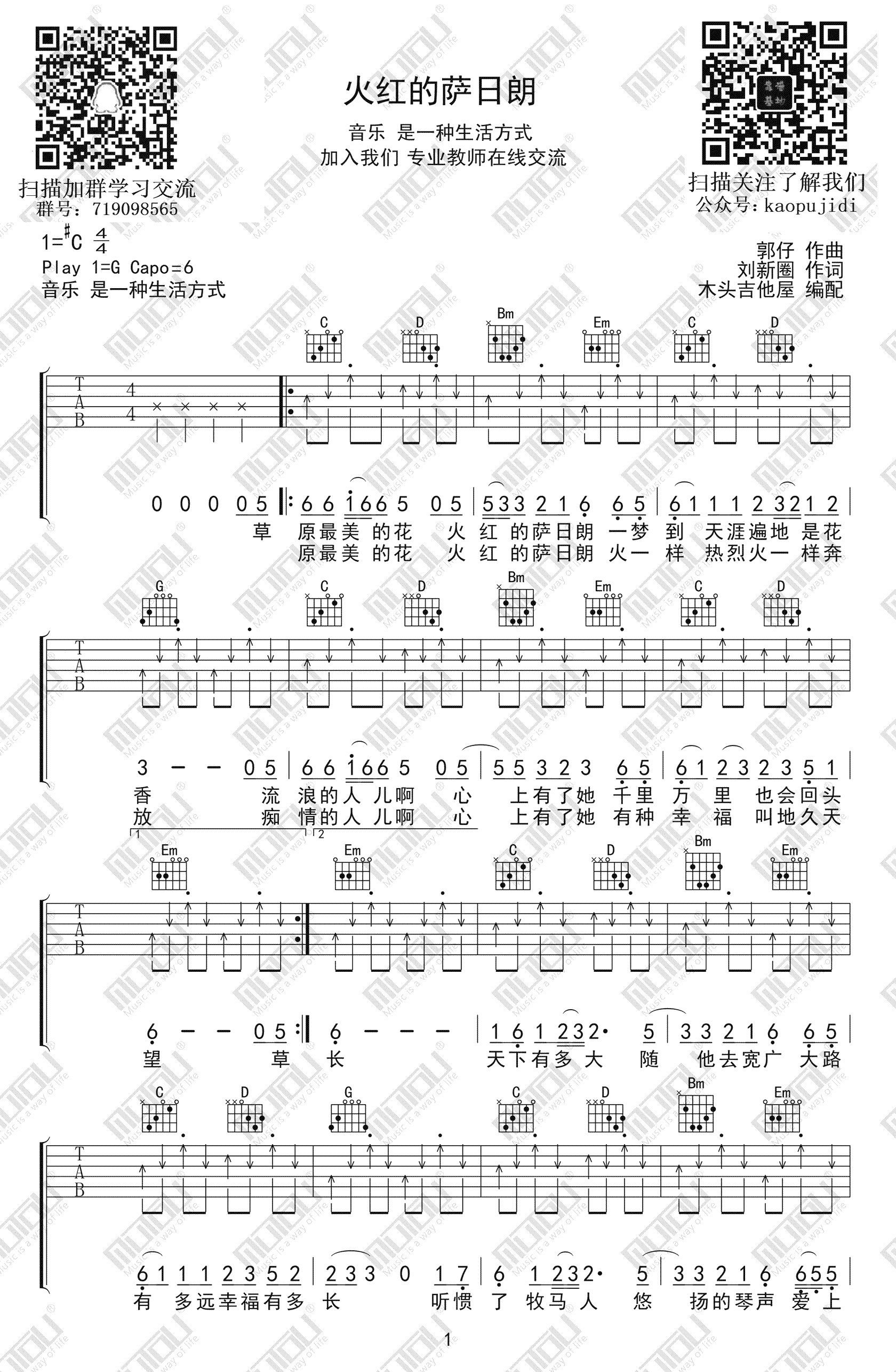 曲谱介绍: 火红的萨日朗吉他谱,乌兰托雅演唱,原调升G,选用G调,变调夹夹六品。火红的萨日朗六线谱,切音版编配,木头吉他屋编配出品,更新上传。 自然清新的民族风歌曲,融入流行音乐元素,如一抹洗涤我们内心的一曲清流,唱出草原美丽景色,人们的豪放质朴,以及对于美好生活的向往与热爱。