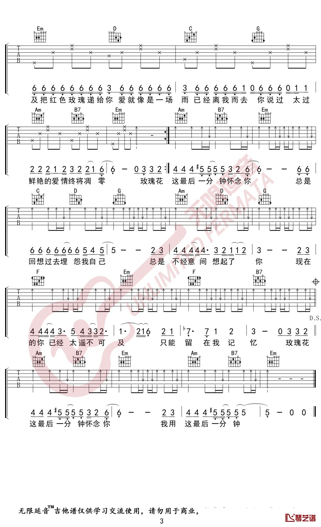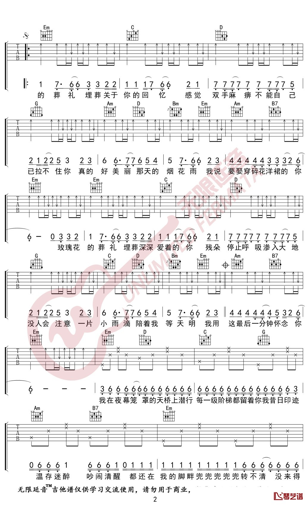 曲谱介绍: 许嵩《玫瑰花的葬礼》吉他弹唱谱,采用G调指法编配,共有3张高清图谱。