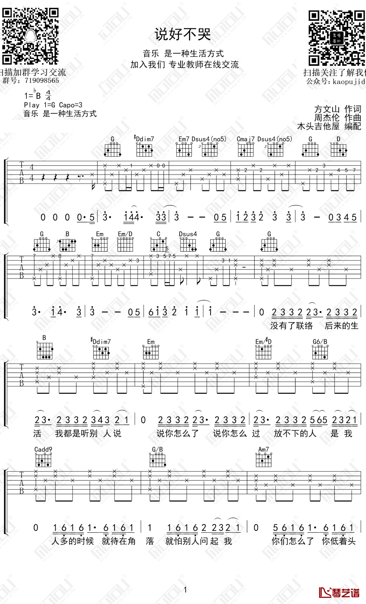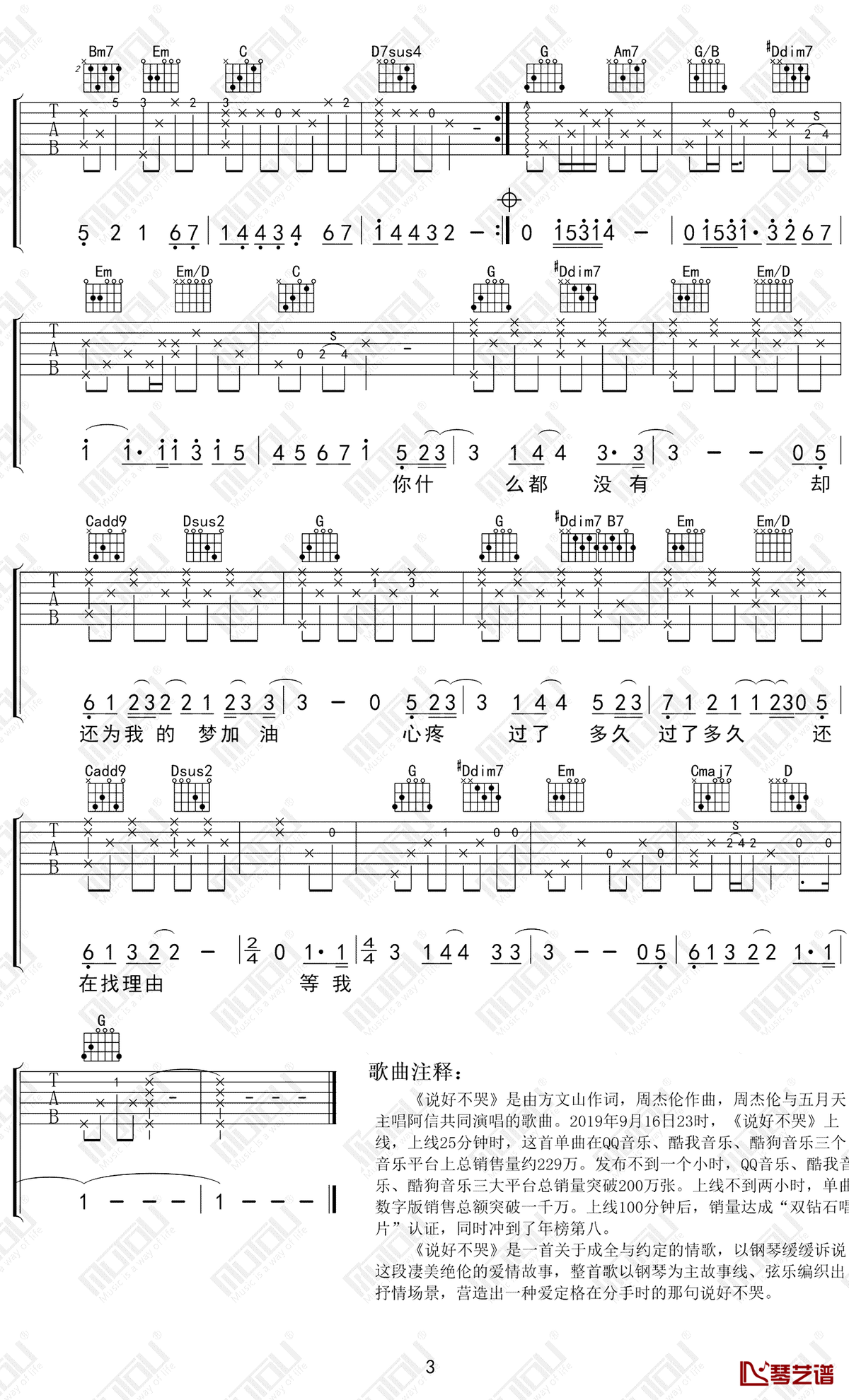 曲谱介绍: 周杰伦《说好不哭》吉他弹唱谱,采用G调指法编配,共有3张高清图谱。