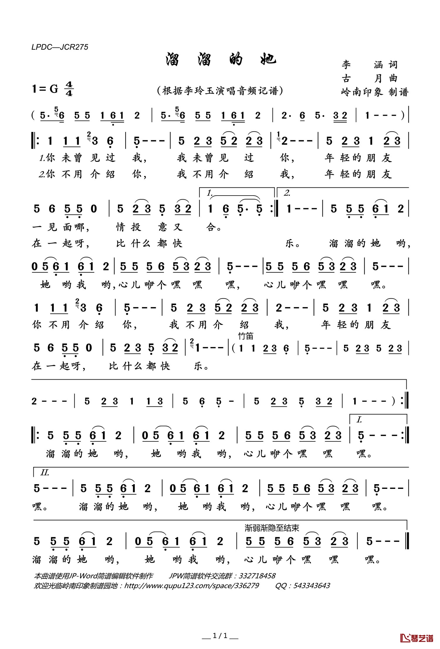 曲谱介绍: 李玲玉《溜溜的她》歌词_简谱