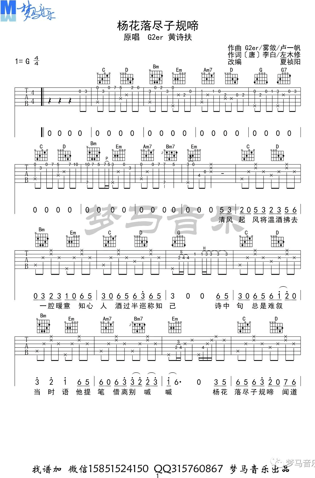 曲谱介绍: 杨花落尽子规啼吉他谱,G2er和黄诗扶演唱,国风堂出品的一首曲调婉转动听的古风歌曲。杨花落尽子规啼六线谱,梦马音乐编配出品,整理上传。 又是杜鹃啼熟樱花红的时节,烟雨濛濛,鹧鸪声声,踏一江清波采一篮桑椹,于浅水浮萍间,竹笠蓑衣农人的田野,将柔情的雨线素描,涂抹成一副水彩画。这首歌引用了李白写的唐诗《闻王昌龄左迁龙标遥有此寄》。整首歌曲比较简单。