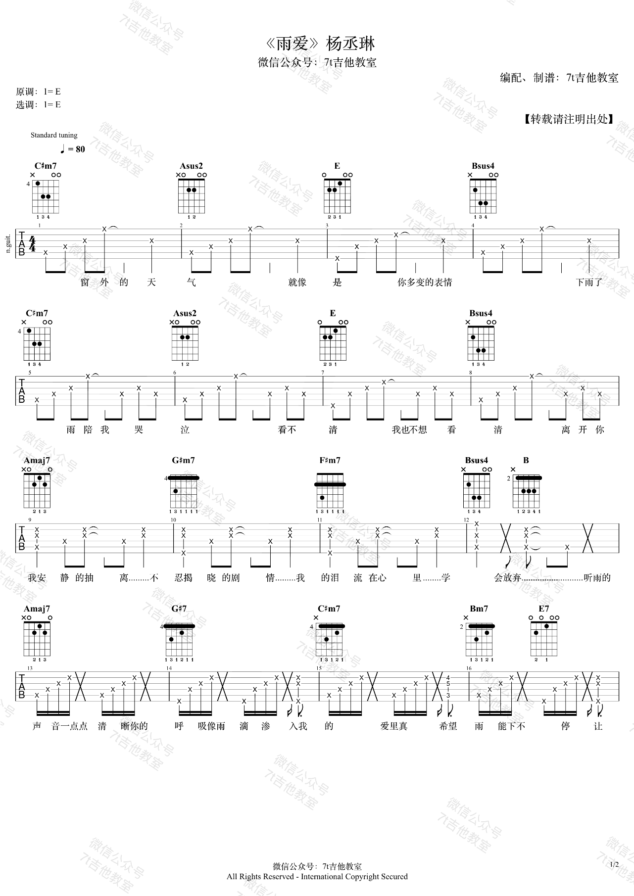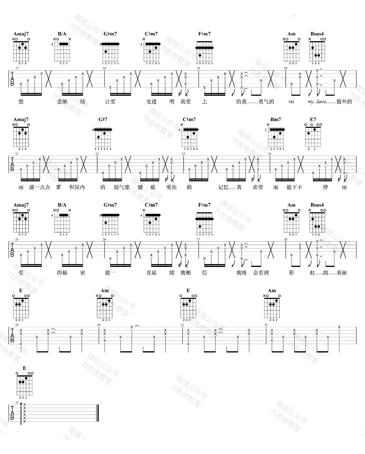 曲谱介绍: 杨丞琳《雨爱》吉他谱,这首歌的原调是E大调,谱子用的也是E大调的指法来编配,视频里是标准音调弦,没有用变调夹,适合音域较高的女生演唱。感谢7T吉他教室编配,蜜汁叉烧肠示范演唱,整理上传。 这首歌曲是杨丞琳的一首代表作品,也是其主演偶像剧《海派甜心》的片尾曲。初学者如果觉得谱子的节奏型太难,可以用最基础的节奏型来代替。如果觉得原版太高,可以采用降半音调弦。