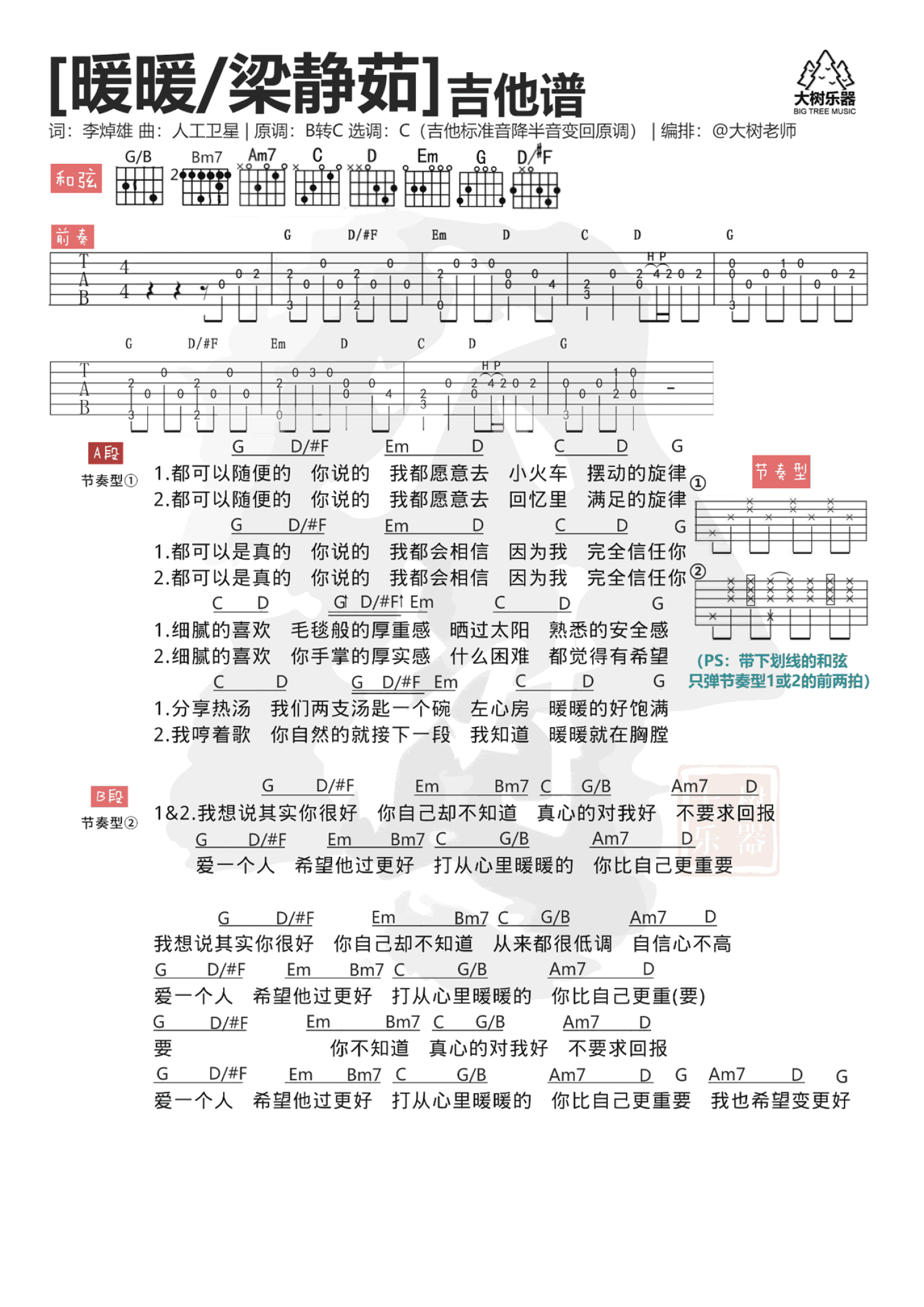 曲谱介绍: 暖暖吉他谱,梁静茹演唱的一首经典老歌,《暖暖》吉他弹唱谱,原调B转C,选用C(吉他标准音降半音变回原调)。这是一首非常有治愈力的歌曲,曾经恋爱时一遍一遍的听,后来歌还是一直听,只是人始使不是同一个,生命中总会遇到一个让你暖暖的人,希望有一天能唱给你听。