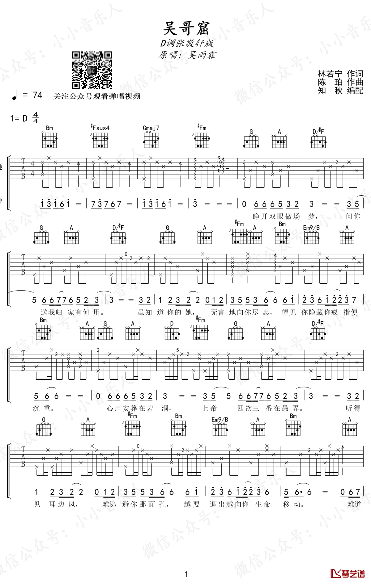 曲谱介绍: 张敬轩/吴雨霏《吴哥窟》吉他弹唱谱,采用D调指法编配,共有3张高清图谱。