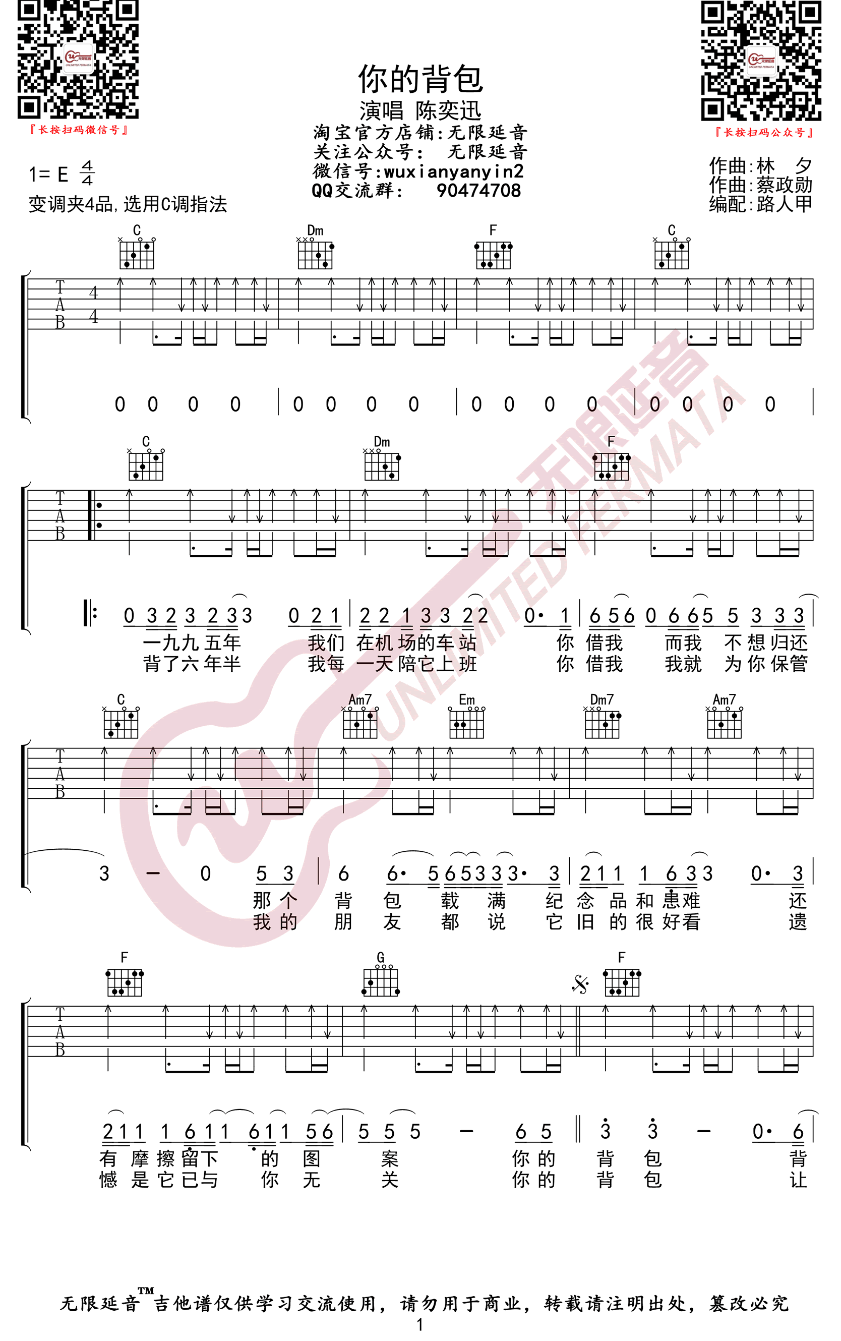 曲谱介绍: 《你的背包》吉他谱,陈奕迅演唱的一首经典代表歌曲,你的背包六线谱,原调E,变调夹夹四品,选用C调指法。无限延音编配出品,吉他谱上传分享。