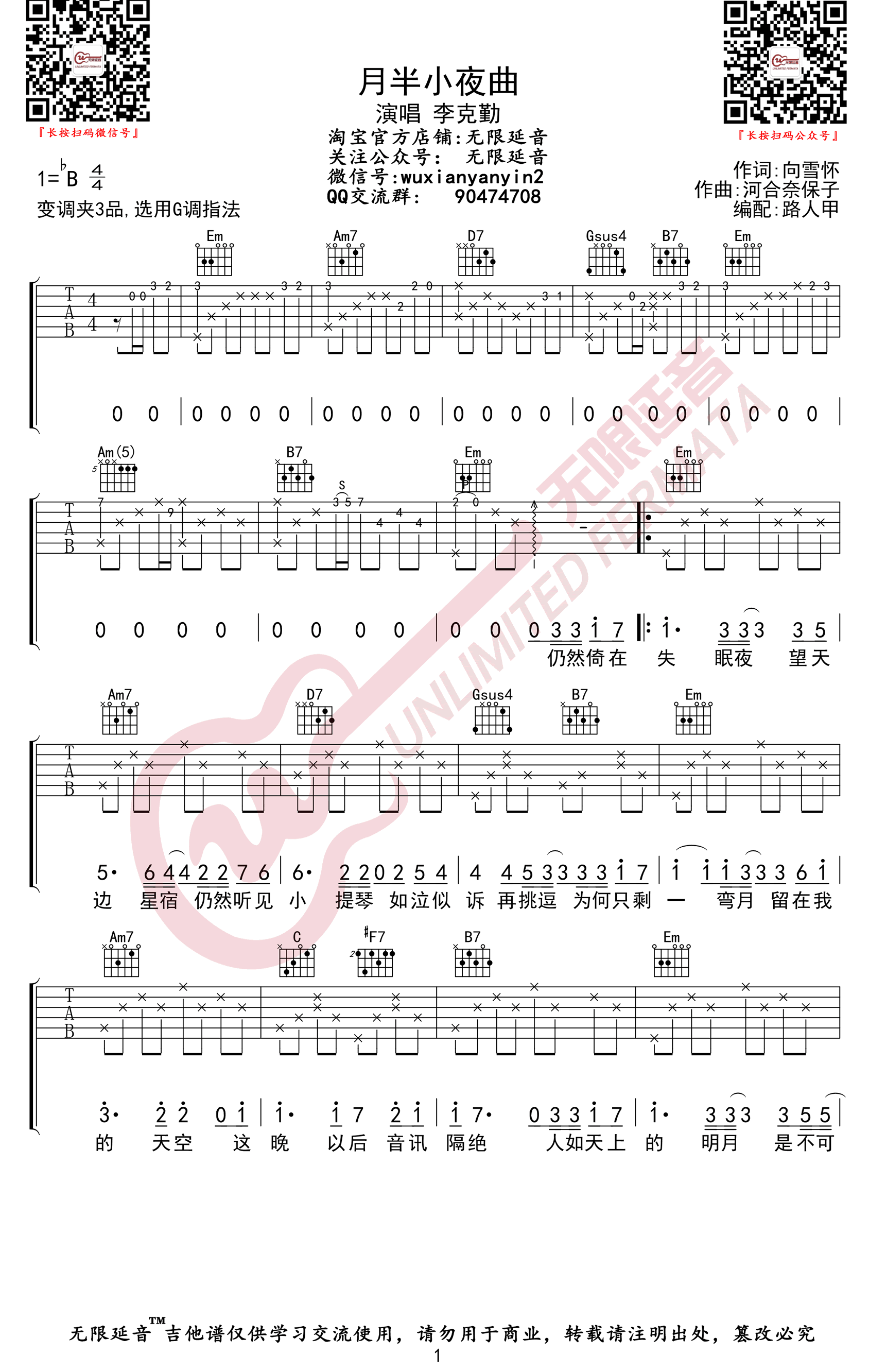 曲谱介绍: 《月半小夜曲》吉他谱,李克勤演唱,一首经典粤语歌曲,月半小夜曲六线谱,原调降B,变调夹夹三品,选用G调指法。无限延音编配分享,吉他谱更新上传。 歌曲改编自日文原版河合奈保子的《ハーフムーン セレナーデ》,忧伤深沉凄楚动听的旋律,直抵人心的歌词,伴着如泣如诉的小提琴,这么多年过去了依旧听不腻,前奏一响起,内心的万般思绪也自然而然地翻涌起来。