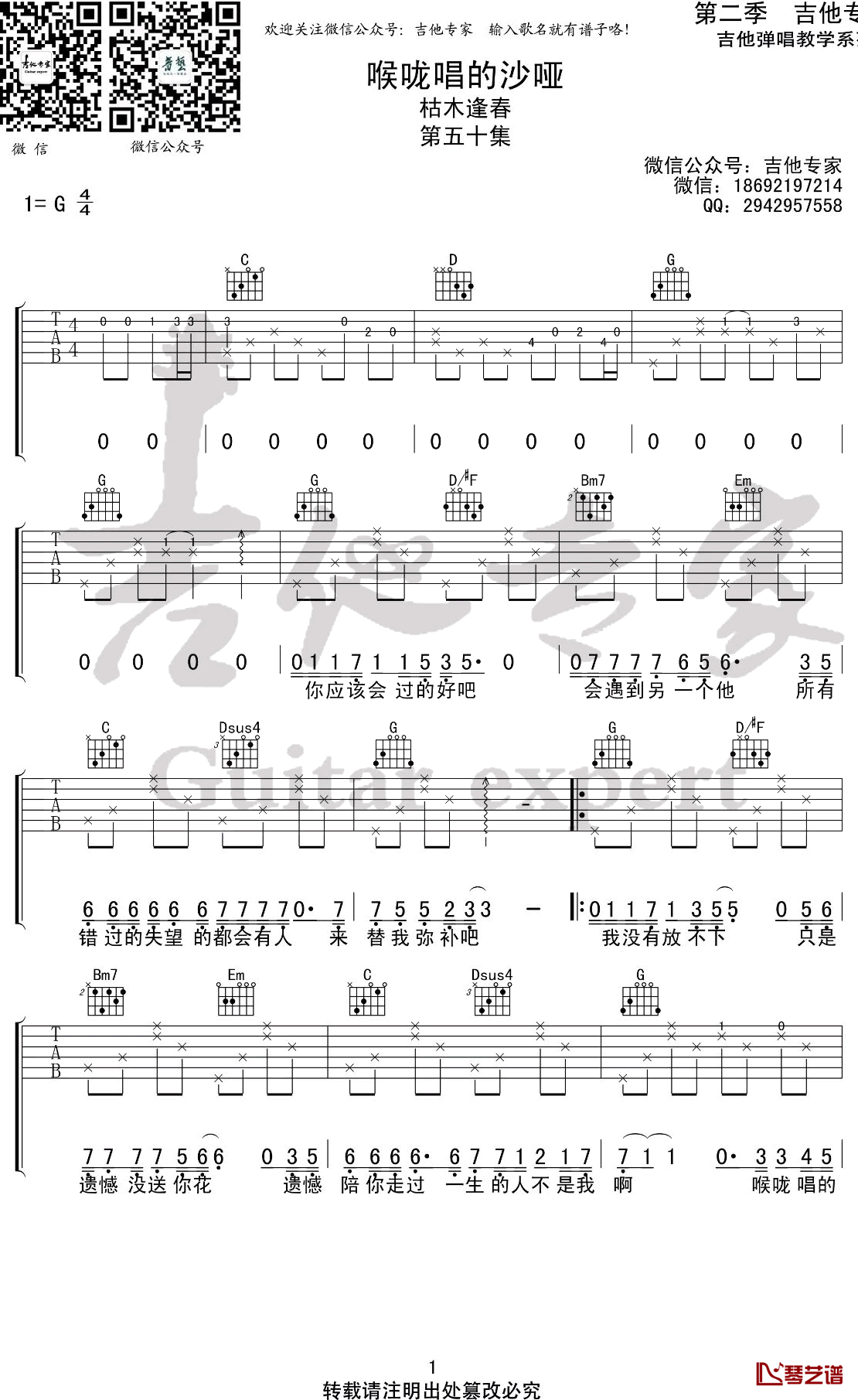 曲谱介绍: 枯木逢春《喉咙唱的沙哑》吉他弹唱谱,采用G调指法编配,共有3张高清图谱。