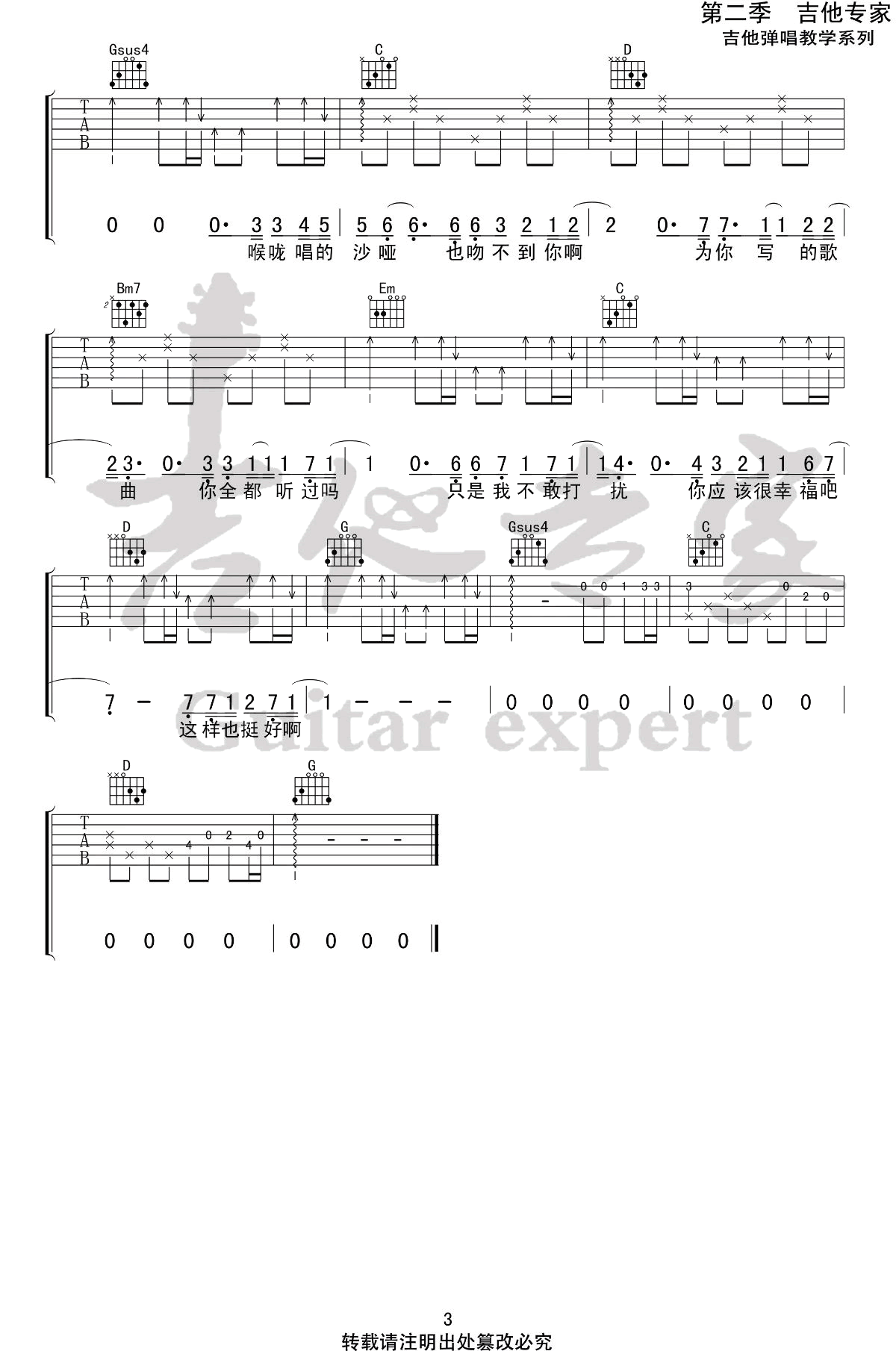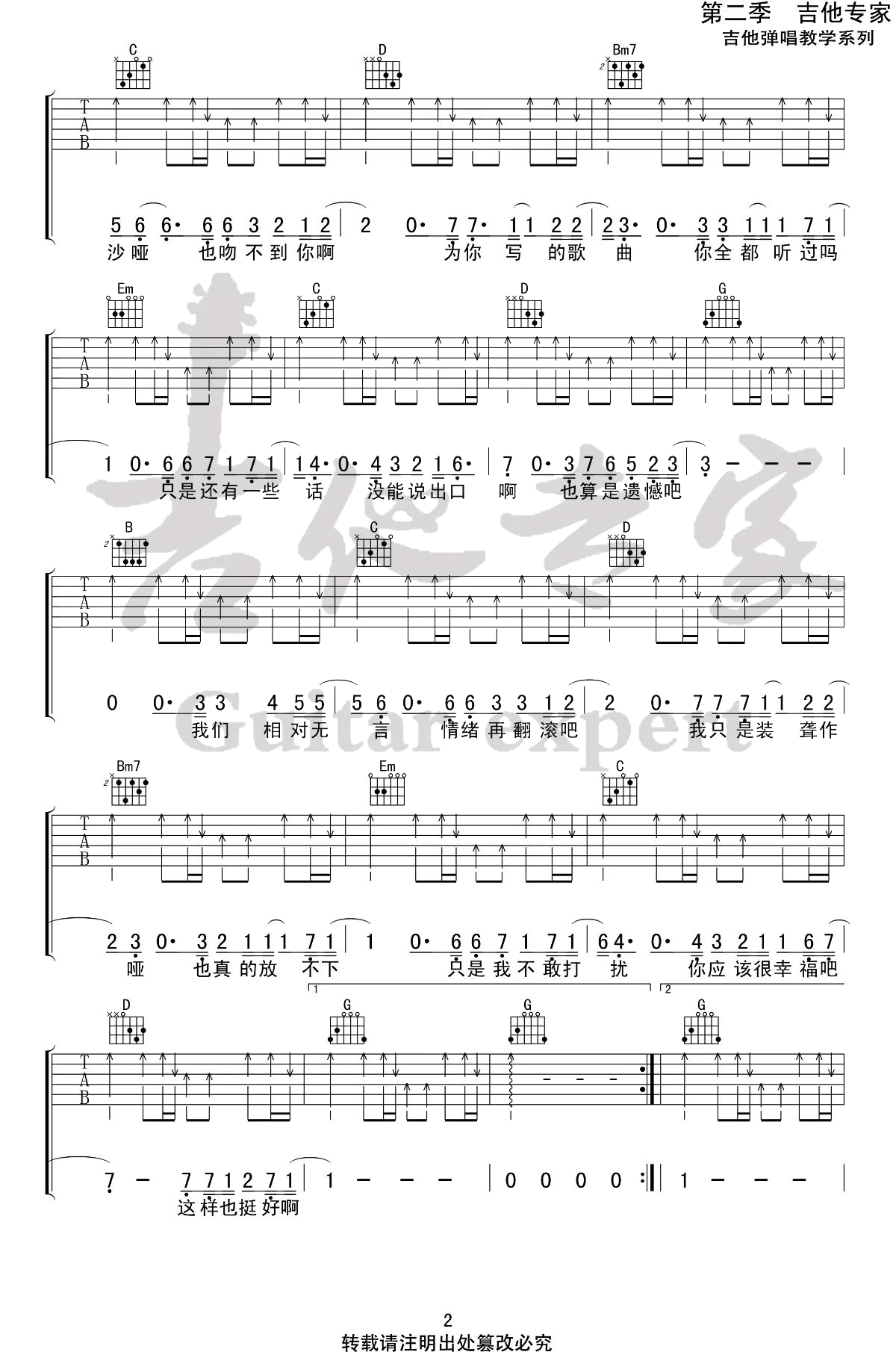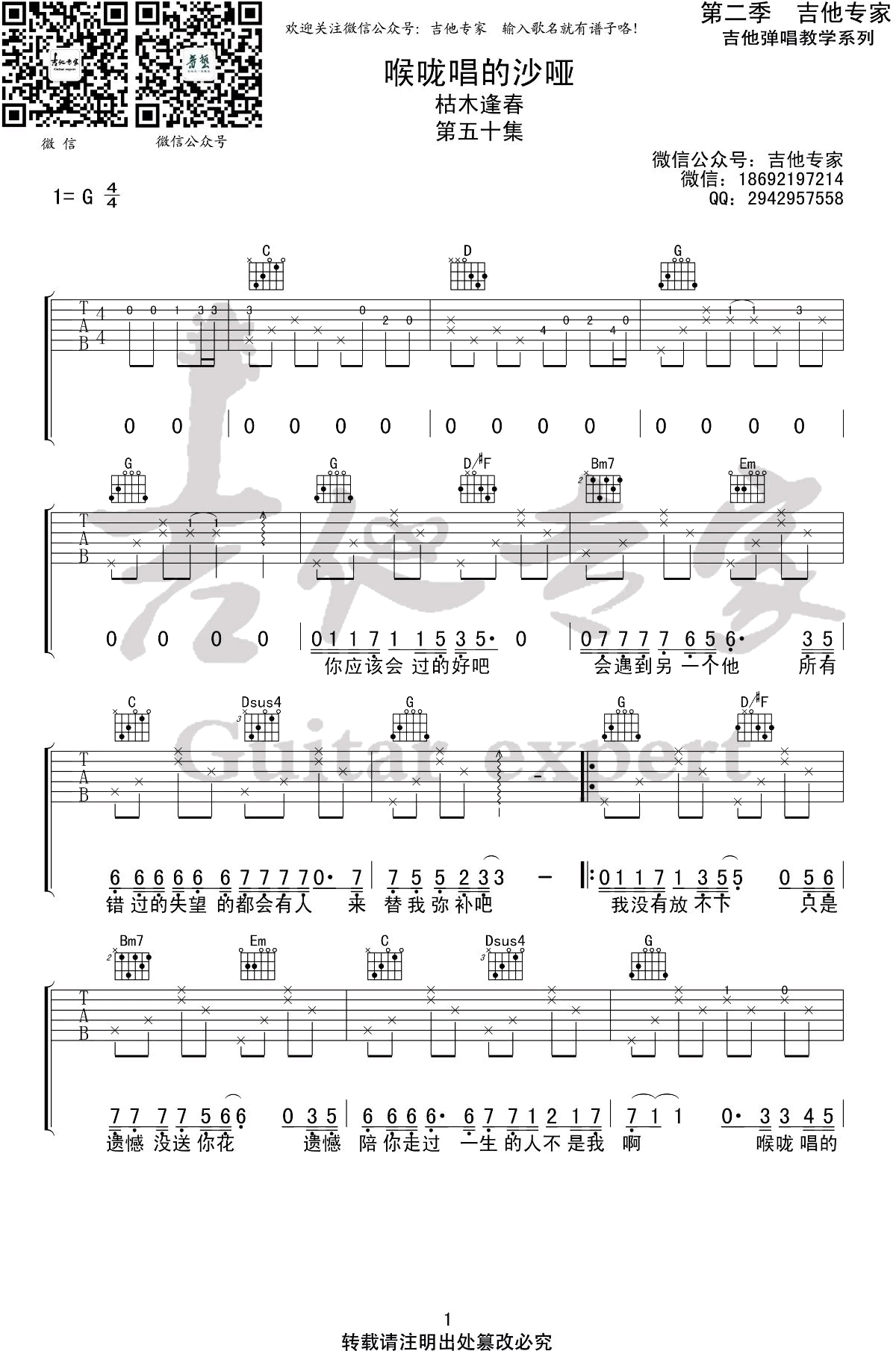 曲谱介绍: 《喉咙唱的沙哑》吉他谱,枯木逢春的一首歌曲,喉咙唱的沙哑,我吻不到你啊,歌曲采用G调弹唱六线谱,三张图片谱例。感谢吉他专家编配制谱,上传分享。 每个最黑的夜晚,都有最深情的吟唱,枯木逢春的这首民谣作品,用平凡至切的词,感人至深的曲,唱我们暗夜里最孤独的歌。