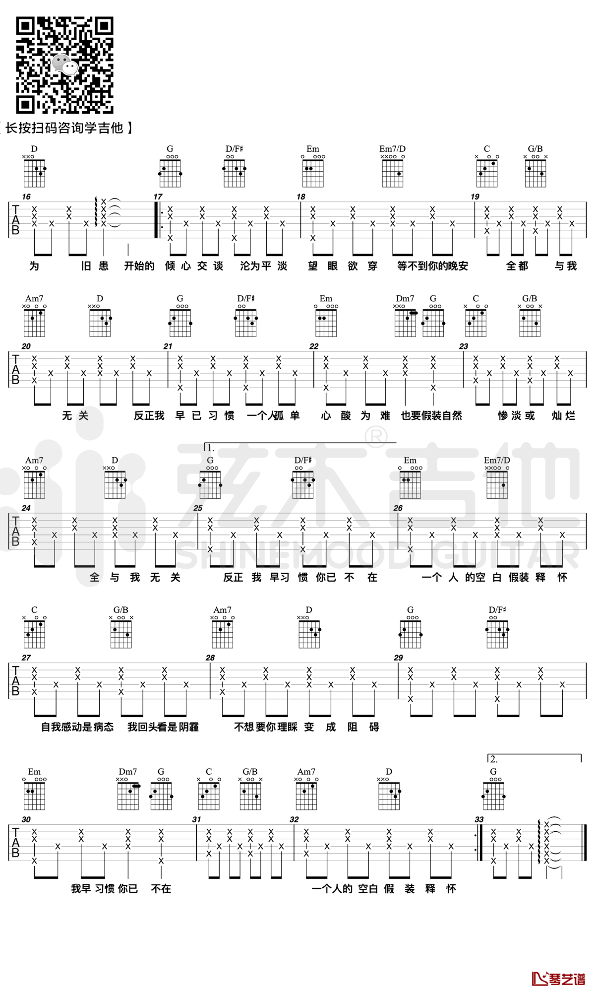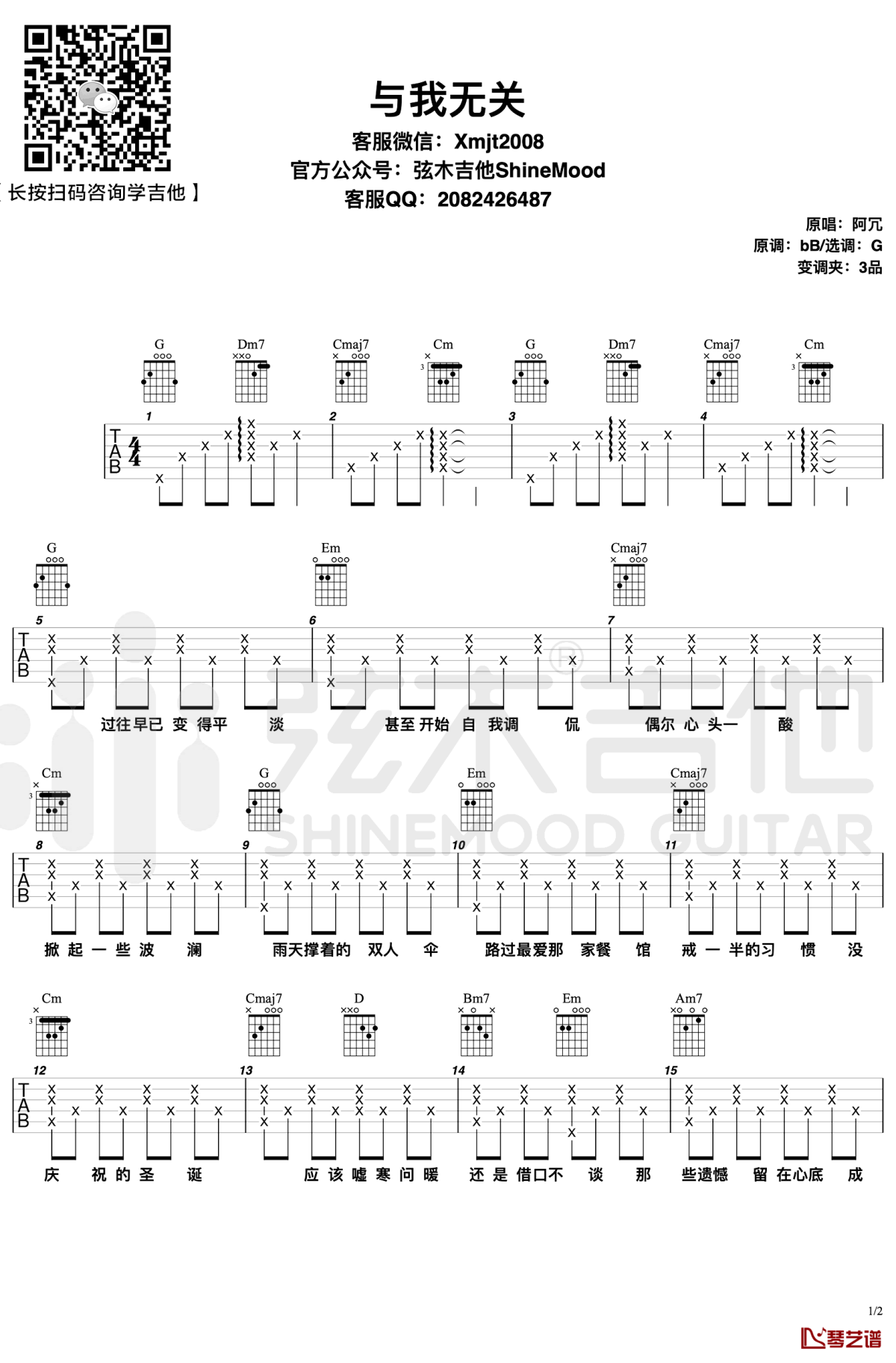 曲谱介绍: 阿冗《与我无关》吉他弹唱谱,采用G调指法编配,共有2张高清图谱,免翻页排版设计。