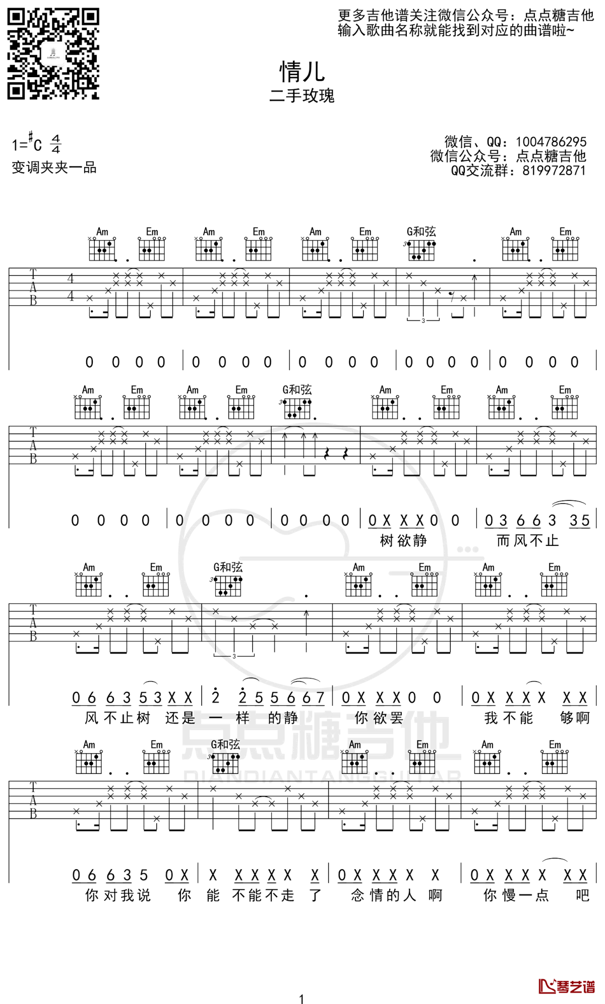 曲谱介绍: 二手玫瑰《情儿》吉他弹唱谱,共有4张高清图谱。