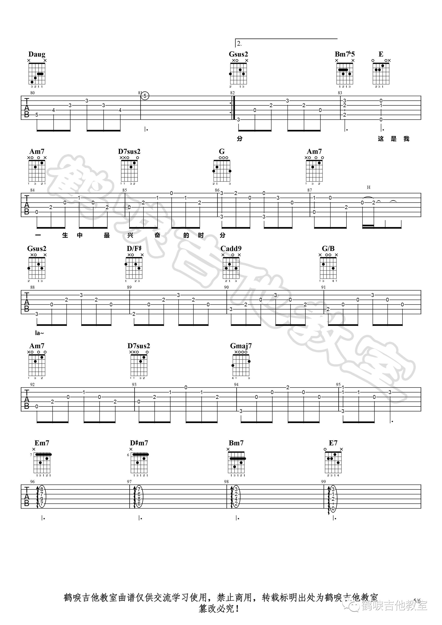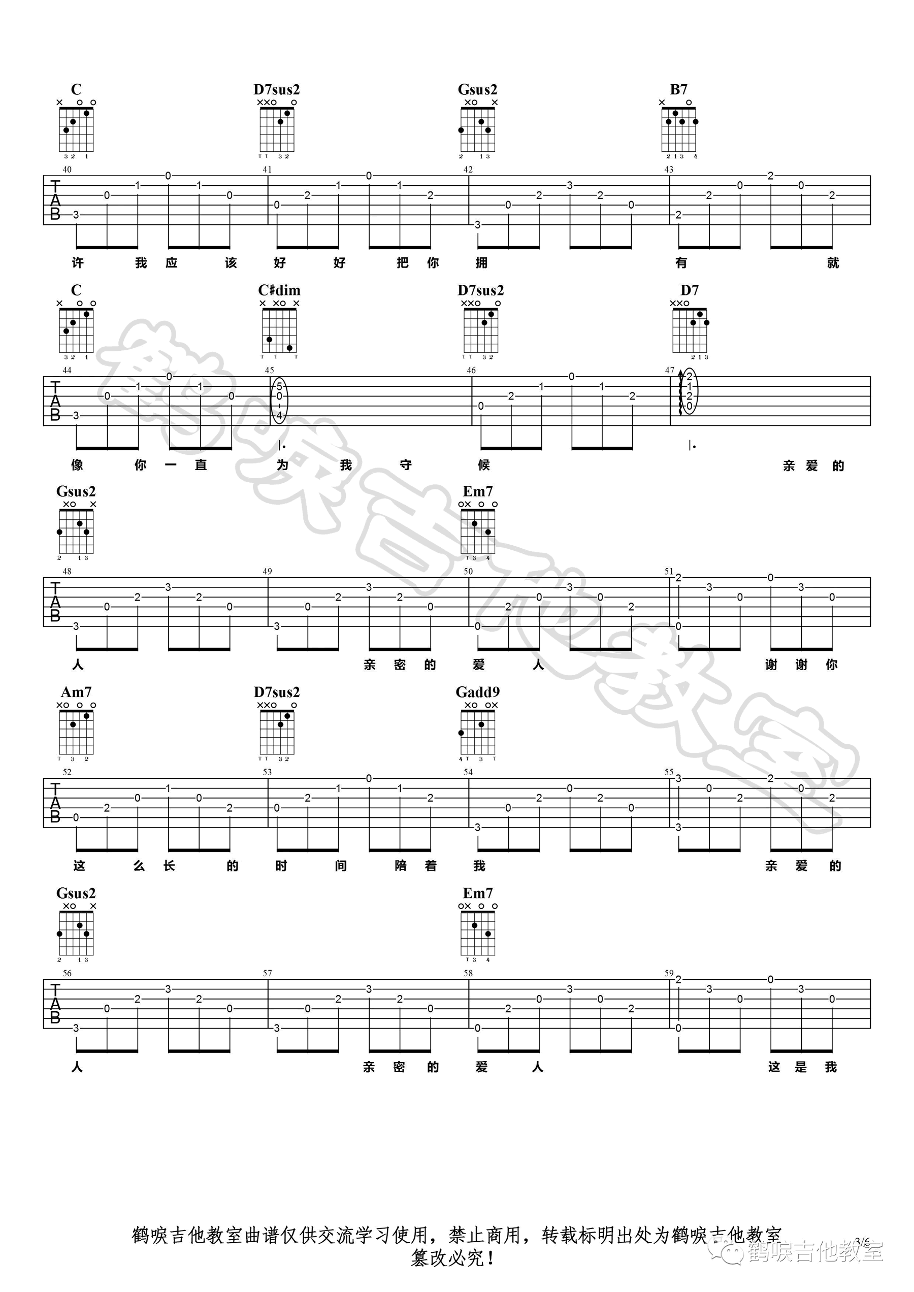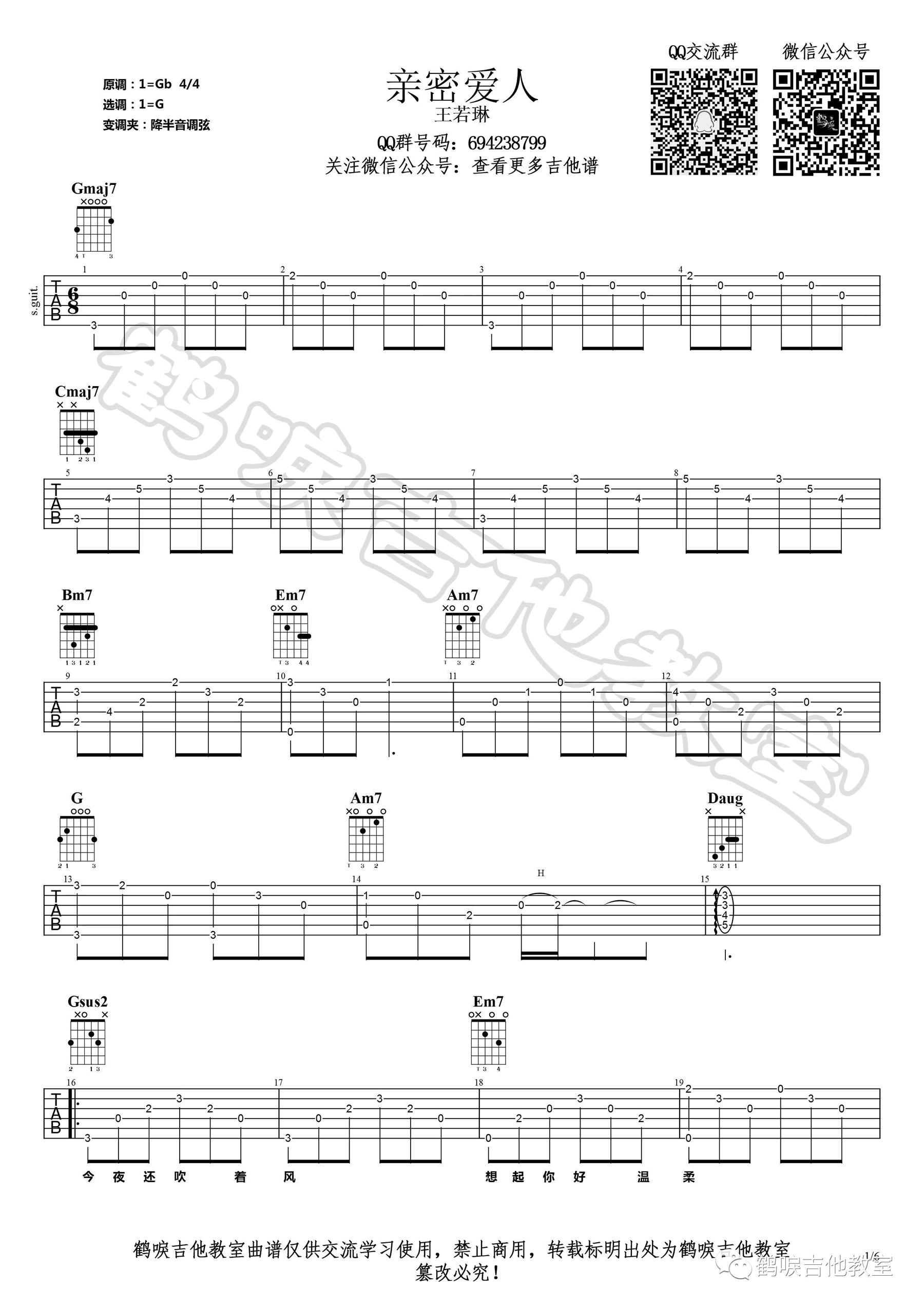曲谱介绍: 《亲密爱人》吉他谱,王若琳演唱版本,原调Gb,选调G,降半音调弦。亲密爱人六线谱,完整编配共六张高清图片谱。鹤唳吉他教室出品,并带来歌曲的吉他弹唱示范,整理上传。 这首歌曲原唱是梅艳芳,王若琳版亲密爱人,细腻温柔,唱出了歌曲的情谊绵绵,听来就象冷天的一杯热茶,捧在手上,温热传递,抿一口,暖在心上。……