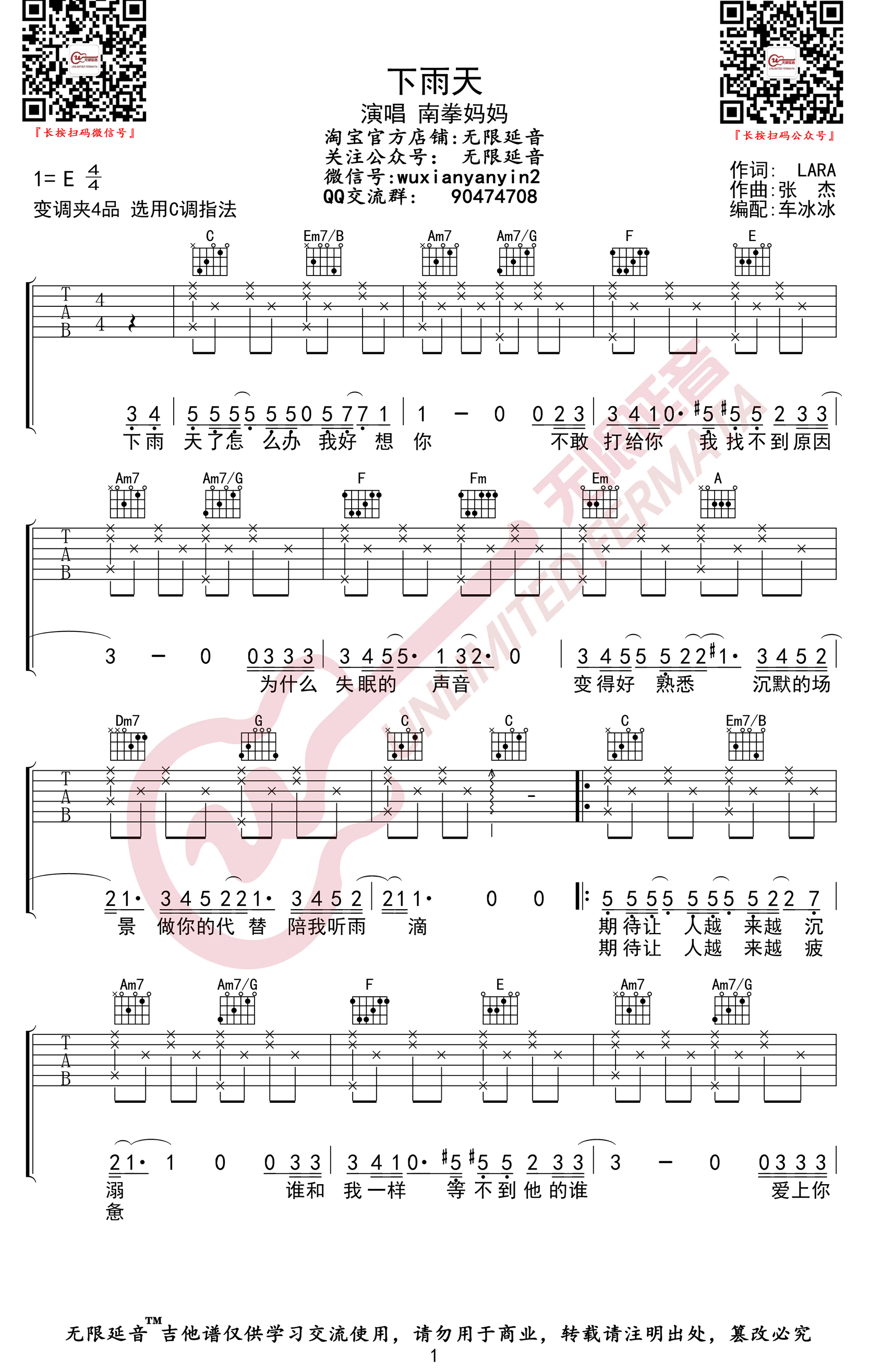 曲谱介绍: 下雨天吉他谱,南拳妈妈梁心颐lara演唱,下雨天六线谱,原调E调,变调夹夹第四品,选用C调指法,三张高清图片谱,无限延音编配出品,整理上传。 据说这是很多人下雨天都会想起的一首歌,一首十多年前的经典老歌,熟悉的旋律响起,是否依然让你能回味起当年的心境。
