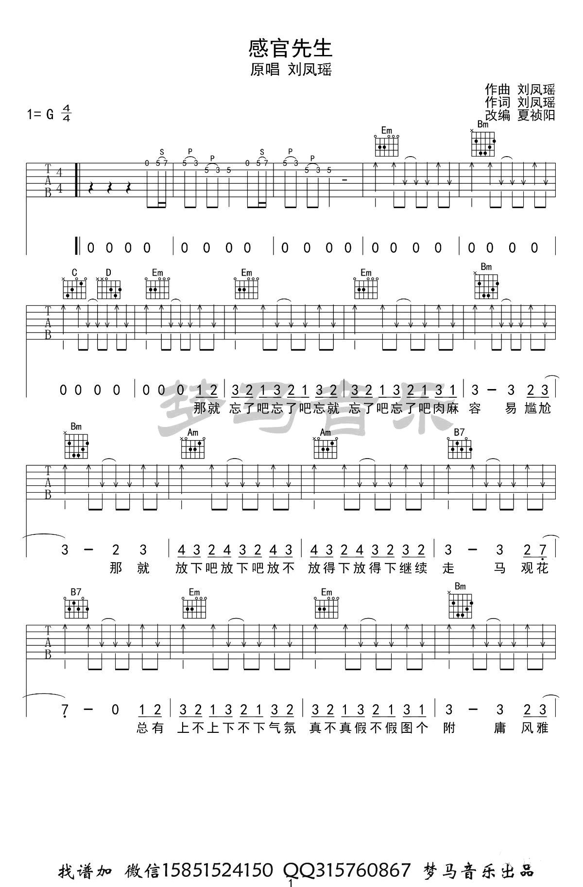 曲谱介绍: 《感官先生》吉他谱,刘凤瑶词曲创作演唱,歌曲具现现实生活,唱出人生需要随遇而安的人生态度。感官先生六线谱,G调弹唱谱,三张高清弹唱图片谱。梦马音乐编配出品,上传更新。 夏祯阳老师:本期发布的是歌曲是最近在抖音上听到很多的一首歌。可能是太新了,网上目前还没有什么这首歌的谱子,连简谱都得自己扒。歌曲很好听,只是在几个音乐平台上都是要付费收听的。新歌在积累名气和粉丝的阶段,还是应该免费播放比较好。不然确实很打击大家听歌的积极性。歌曲很简单,弹唱也很简单。喜欢这首歌曲的都可以试试。