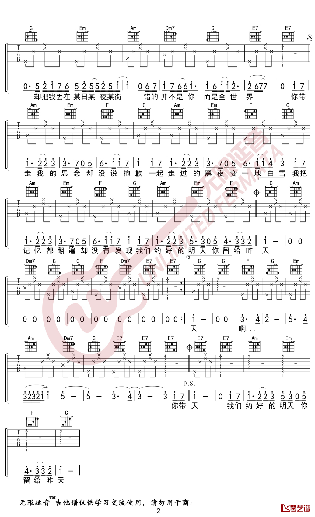 曲谱介绍: 徐良/汪苏泷《后会无期》吉他独奏谱,共有2张高清图谱,免翻页排版设计。