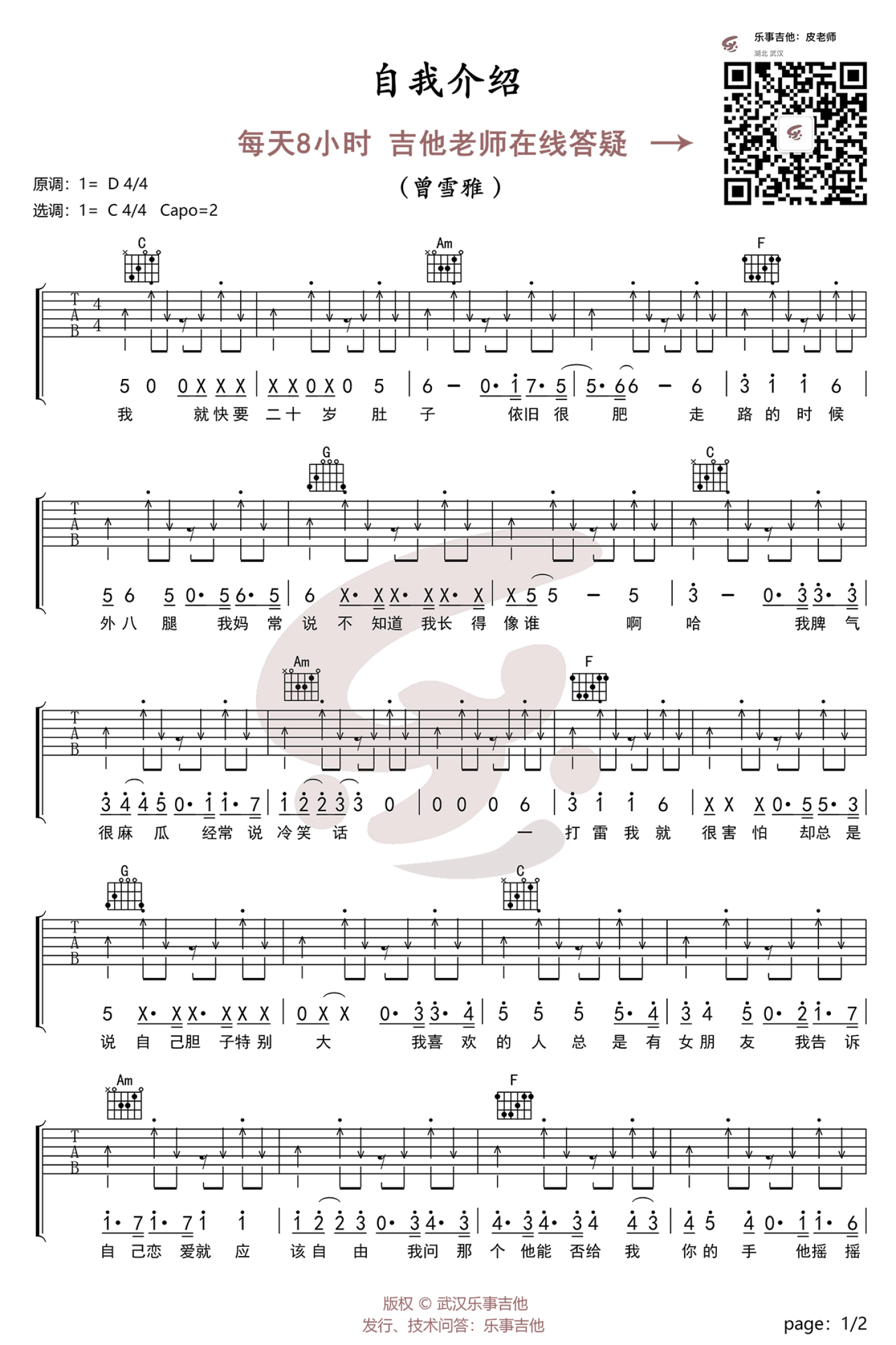 自我介绍吉他谱 - 曾雪雅 - C调吉他弹唱谱