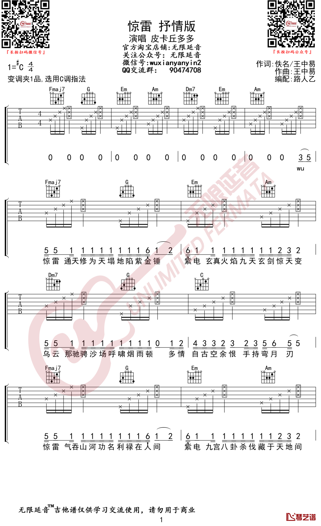 曲谱介绍: 皮卡丘多多《惊雷》吉他弹唱谱,共有3张高清图谱。