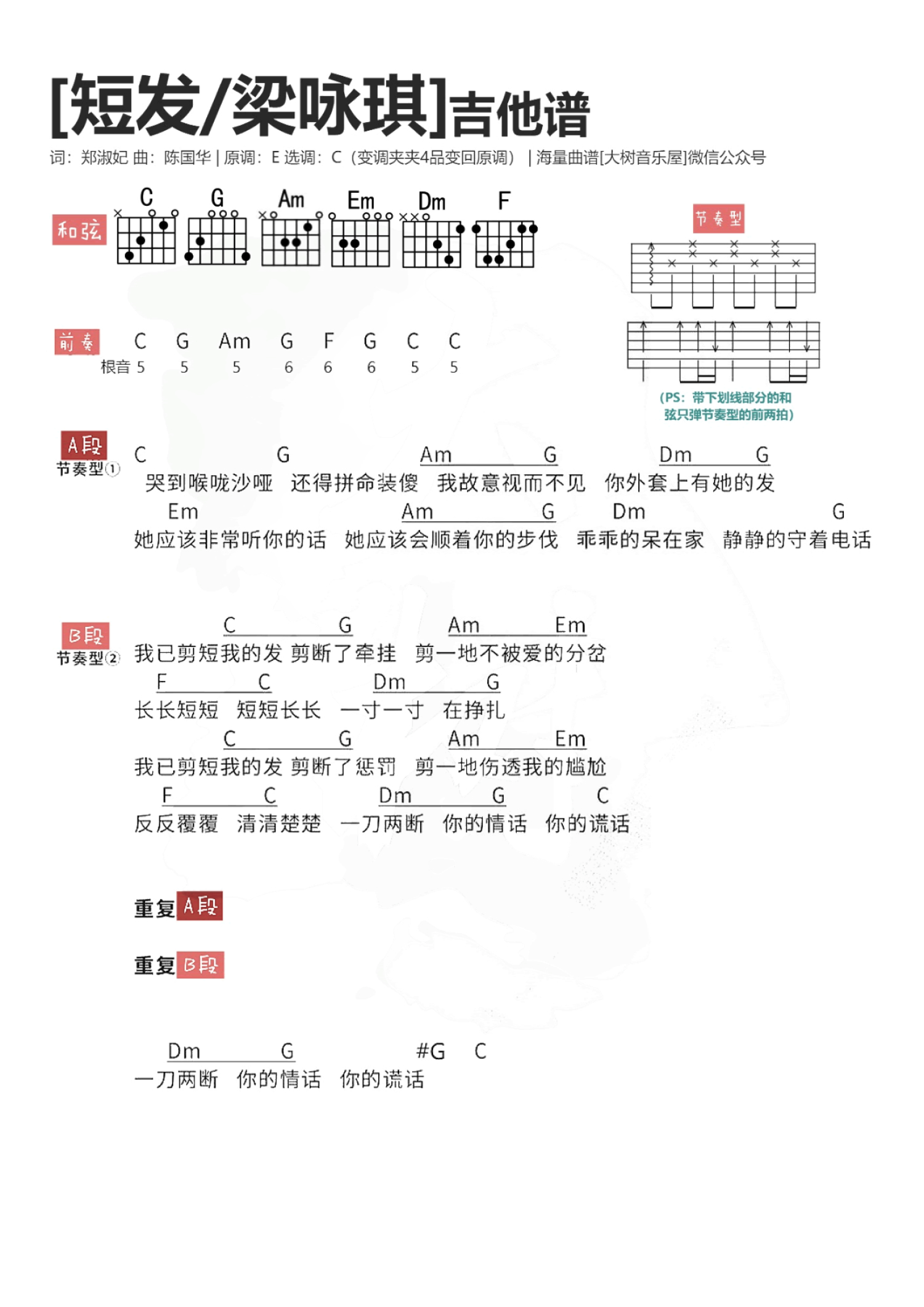 曲谱介绍: 短发吉他谱,梁咏琪经典代表作,短发吉他弹唱谱,原调E,选用C调指法,变调夹夹第四品。我已剪短我的发,剪断了牵挂,剪一地不被爱的分岔。短发代言人梁咏琪的这首歌曲,曾经风靡大江南北,剪去长发的张靓颖在《梦想的声音》节目中深情演唱了这首老歌,不仅唱哭了自己,也唱哭了千万在夜晚有所牵挂的人。