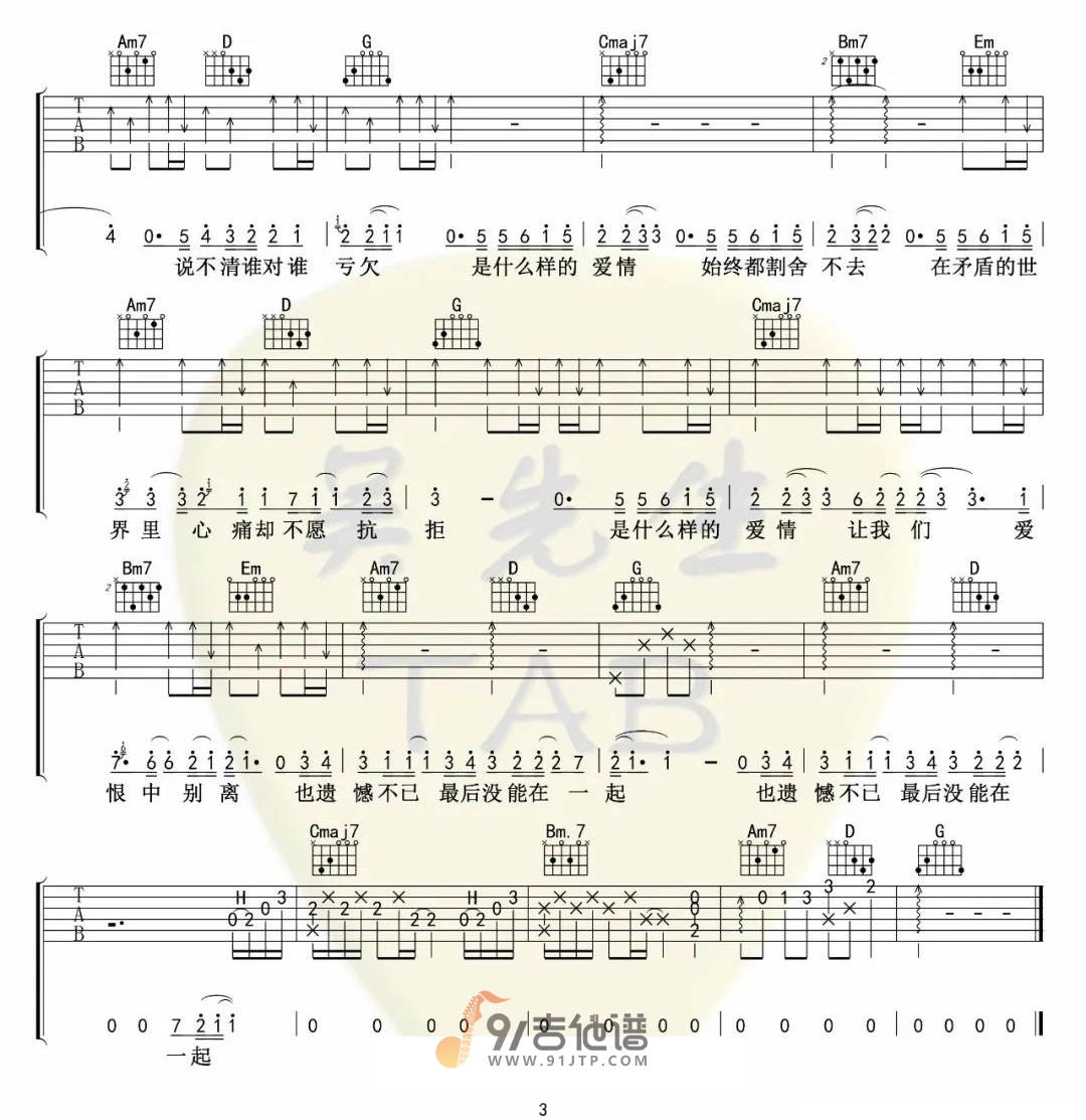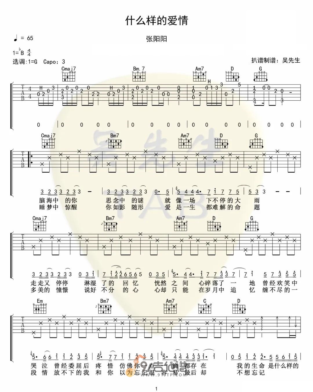 曲谱介绍: 曲谱简介:什么样的爱情吉他谱,张阳阳演唱的一首歌曲,4/4拍的节奏,这首歌曲的原调为降B调,这里曲谱采用了G调指法进行编配,演唱时夹变调夹3品可回到原调,也可根据个人实际嗓音情况选择。曲谱由吴先生TAB编配出品。