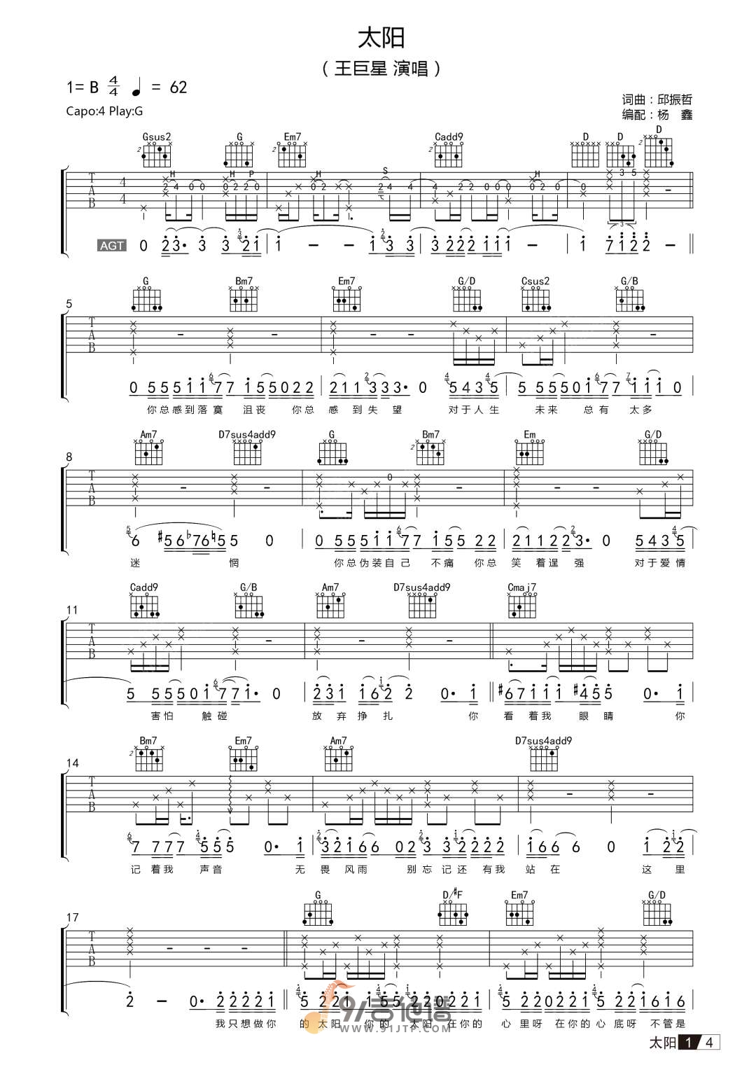 曲谱介绍: 曲谱简介:太阳吉他谱,王巨星演唱的一首歌曲,4/4拍的节奏,这首歌曲的原调为B调,这里曲谱采用了G调指法进行编配,演唱时夹变调夹4品可回到原调,也可根据个人实际嗓音情况选择。曲谱由杨鑫编配出品