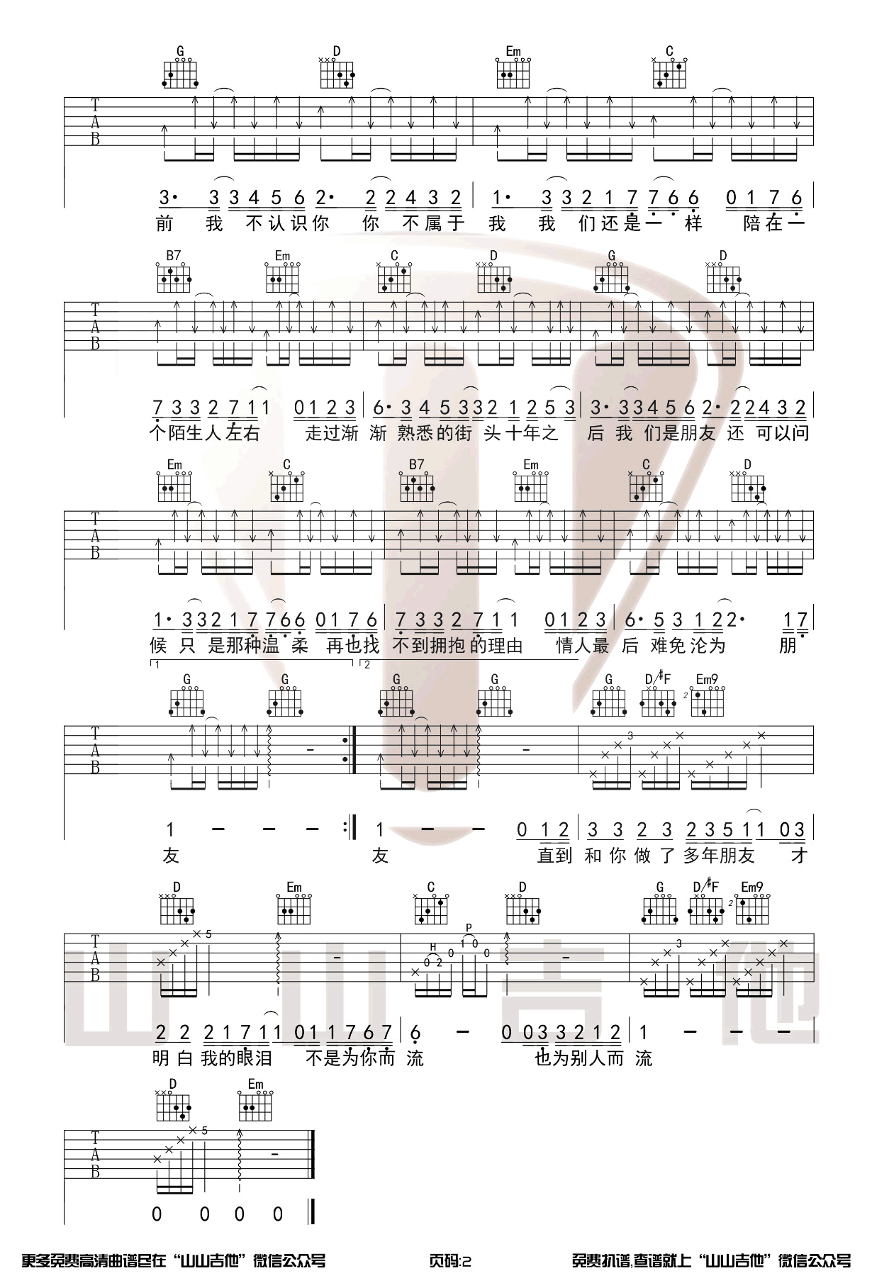 曲谱介绍: 吉他谱介绍:十年吉他谱,陈奕迅演唱的一首歌曲,4/4拍的节奏,这首歌曲的原调为降A调,这里曲谱采用了G调指法进行编配,演唱时夹变调夹1品可回到原调,也可根据个人实际嗓音情况选择。曲谱由琴谱网更新上传,共2张高清图片弹唱吉他谱例,来源于@山山吉他编配出品。