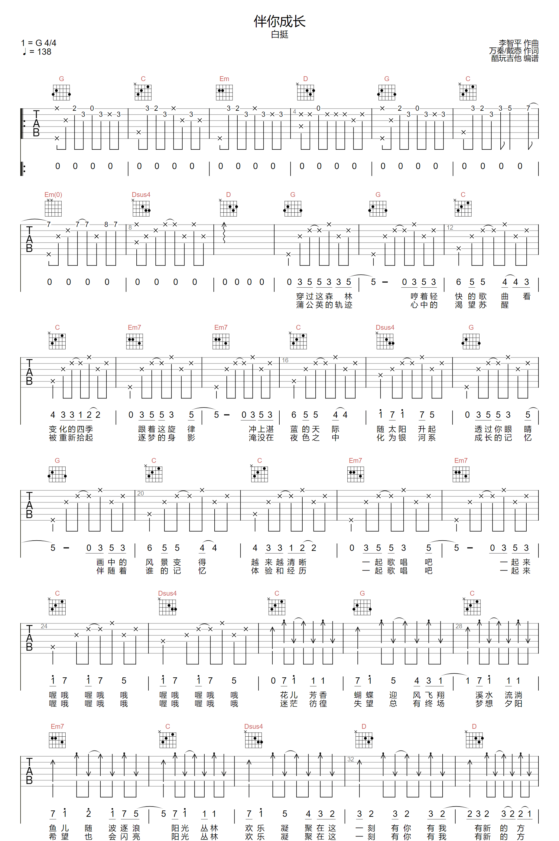 伴你成长吉他谱 - 白挺 - G调吉他弹唱谱 - 原版