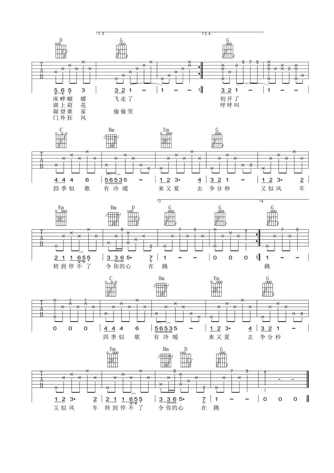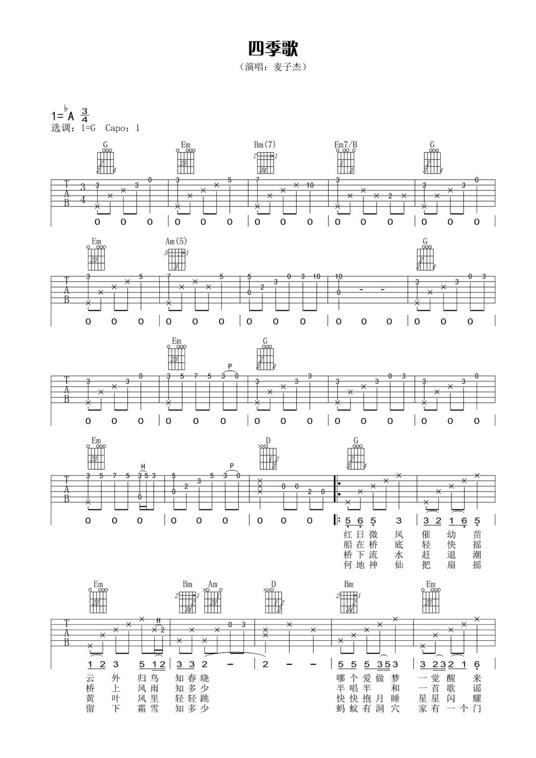 曲谱介绍: 吉他谱介绍:四季歌吉他谱,达明一派演唱的一首歌曲,3/4拍的节奏,这首歌曲的原调为降A调,这里曲谱采用了G调指法进行编配,演唱时夹变调夹1品可回到原调,也可根据个人实际嗓音情况选择。曲谱由琴谱网更新上传,共2张高清图片弹唱吉他谱例,曲谱来源于网络转载,编配制谱者暂不详。这首歌可称脍炙人口的一首经典,意境隽永,曲调愉悦,语言别致,充满大自然和生命自身的诗情画意,莫名的让人心动。