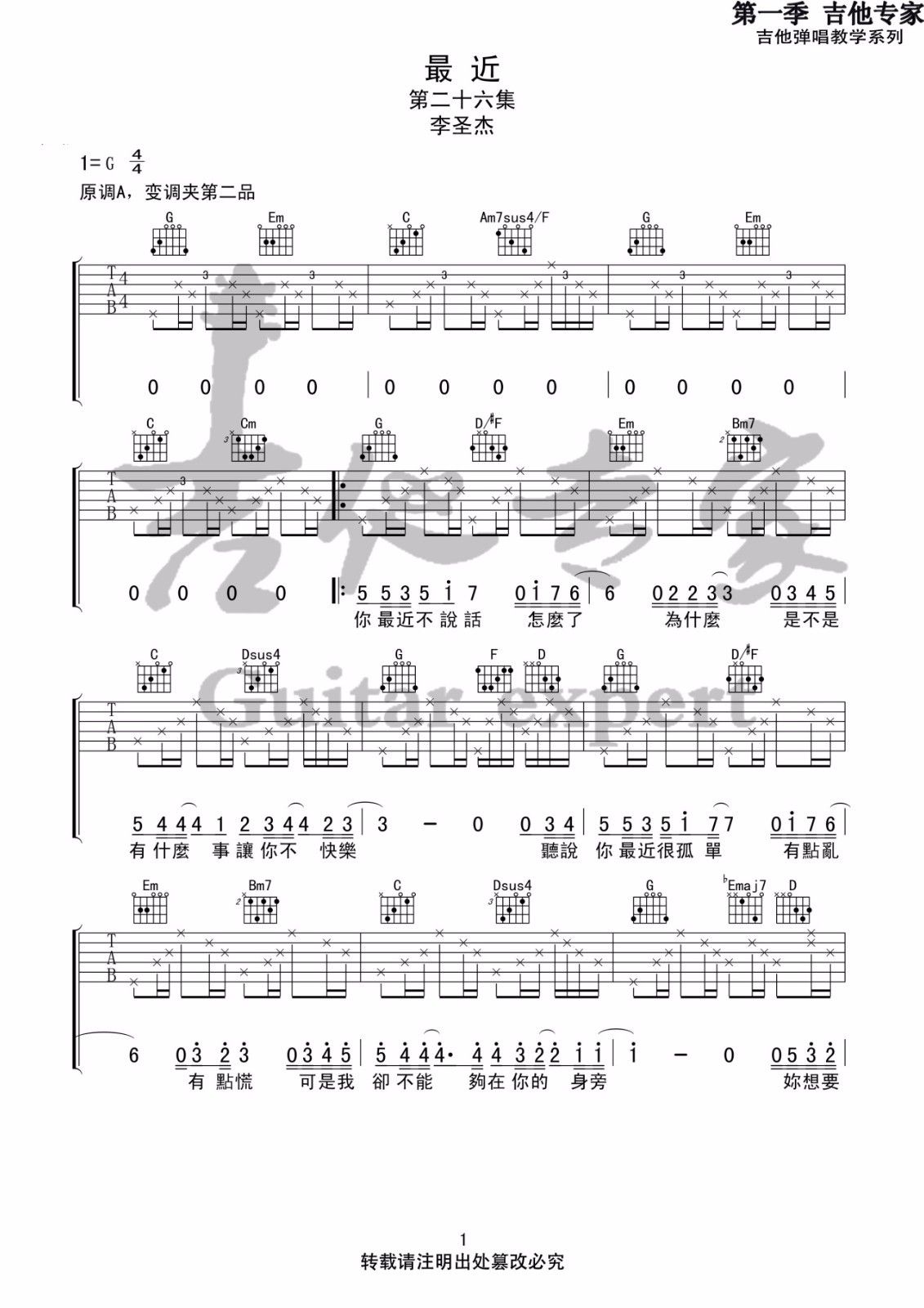 最近吉他谱 - 李圣杰 - G调吉他弹唱谱 - 原版
