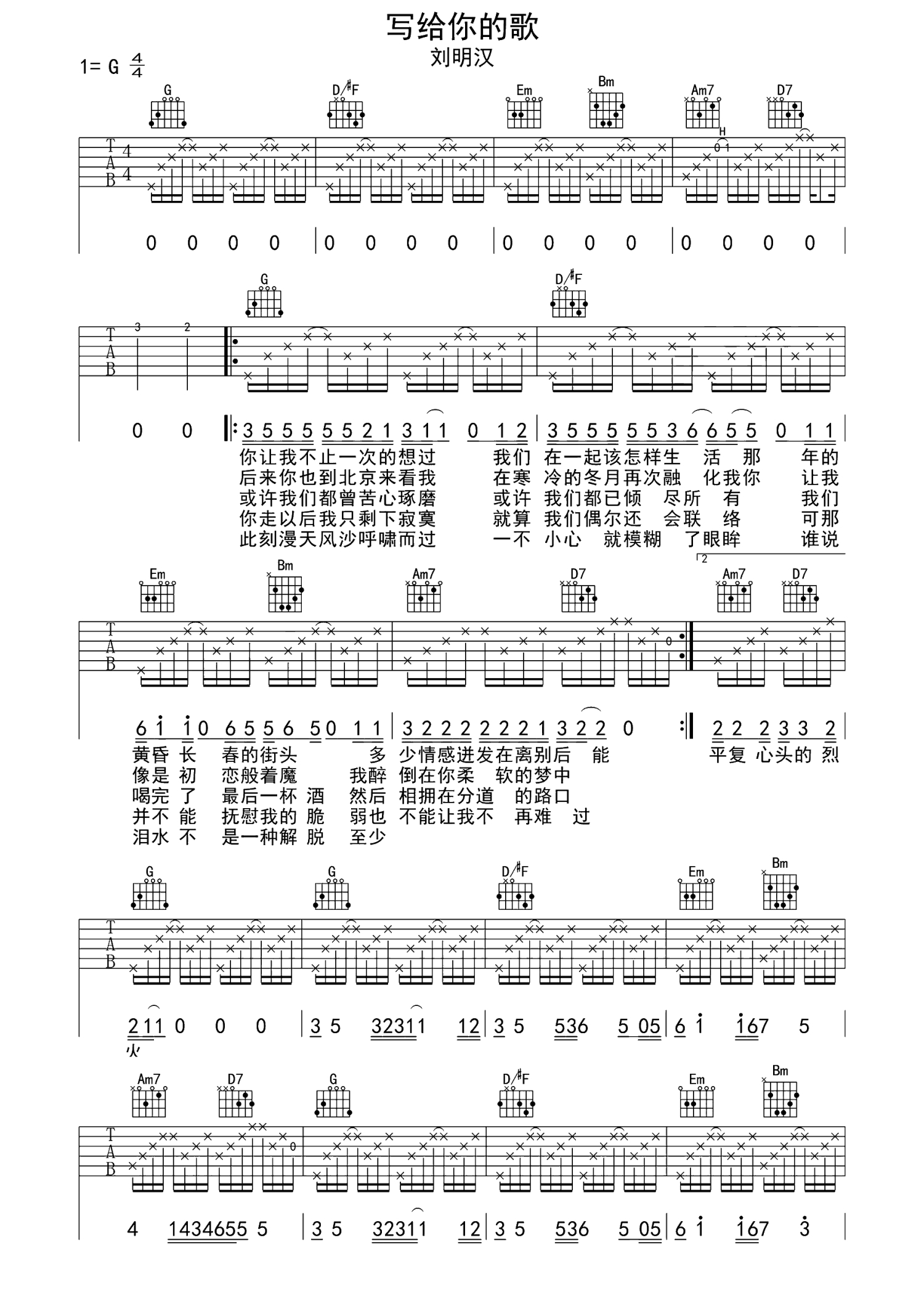 写给你的歌吉他谱 - 刘明汉 - G调吉他弹唱谱